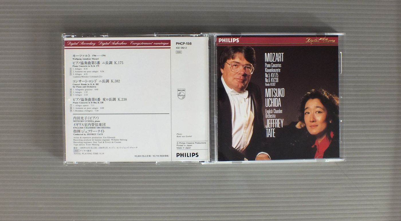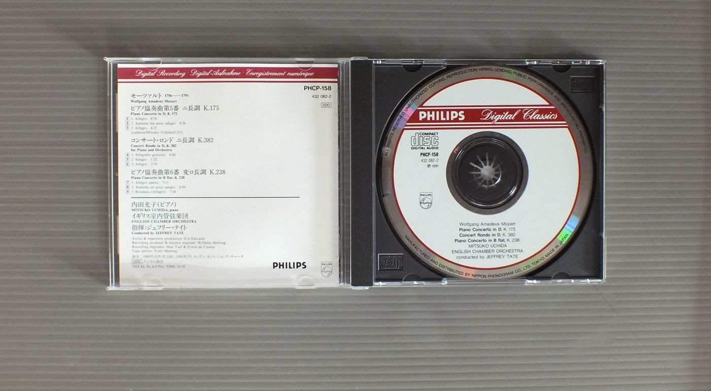 MITSUKO UCHIDA-JEFFREY TATE-ENGLISH CHAMBER ORCH.内田光子+ジェフリー・テイト指揮イギリス管弦楽団/MOZART-PIANO CONC. NOS.5 & 6モーツァルト-ピアノ協奏曲第5番、第6番 PHCP158 製造国:日本盤 / Media:CD外観:EX-盤の状態:EX 価格(税込):¥880 送料 7inch:定形外郵便 360円~LP:定形外郵便 660円~送料は、注文の最終画面で確認頂けます。 > > MITSUKO UCHIDA-JEFFREY TATE-ENGLISH CHAMBER ORCH./MOZART-PIANO CONC. NOS.5 & 6 外観 (EX-)特記事項:背スレ有り。ブックレットに書き込み有り。外観EX-の共通説明:ダメージ軽度~多少。 中古品としては普通の状態。シミ、ヨゴレ、スレなど軽く~多少。 盤の状態 (EX)特記事項:あまりスリキズ無くきれいな状態。盤EXの共通説明:盤面のスリキズが薄いものが少し~軽度 音に出そうなものは無いように見える(軽微なソフトティック音は除く)。 Tweet それぞれの画像をクリックすると、大きい写真が見られます こちらの商品もお勧めです 990円 PREVIN - LONDON SYMPHONY ORCHESTRAプレヴィン - ロンドン交響楽団 / BEETHOVEN - SYMPHONY NO5ベートーヴェン - 交響曲第5番 990円 KARAJAN - VIENNA PHILHARMONIC ORCHESTRAカラヤン - ウィーン・フィルハーモニー管弦楽団 / HOLST - THE PLANETSホルスト - 組曲惑星 990円 KARAJAN - BERLINER PHILHARMONIKERカラヤン - ベルリン・フィル / MOZART - EINE KLEINE NACHTMUSIKモーツアルト - アイネ・クライネ・ナハトムジーク 1,100円 BOULT他 / MAHLER 9 SYMPHONIES 12 LP BOX 1,540円 BOHM - BERLINER PHILHARMONIKERベーム - ベルリン・フィル / R.STRAUSS - TILL EULENSPIEGELリヒャルト・シュトラウス - ティル・オイレンシュピーゲルの愉快ないたずら 990円 STERN - ORMANDY - THE PHILADERPHIA ORCH.スターン - オーマンディ - フィラデルフィア管弦楽団 / BRAHMS - VIOLIN CONCERTOブラームス - ヴァイオリン協奏曲 1,540円 ABBADO - VIENER PHILHARMONIKERアバド - ウィーン・フィル / BRAHMS - HANGARIAN DANCESブラームス - ハンガリア舞曲 1,540円 BEECHAM - ROYAL PHILHARMONIC ORCHESTAビーチャム - ロイヤル・フィルハーモニー管弦楽団 / MOZART - SYMPHONY NO41 JUPITERモーツアルト交響曲第41番ジュピター