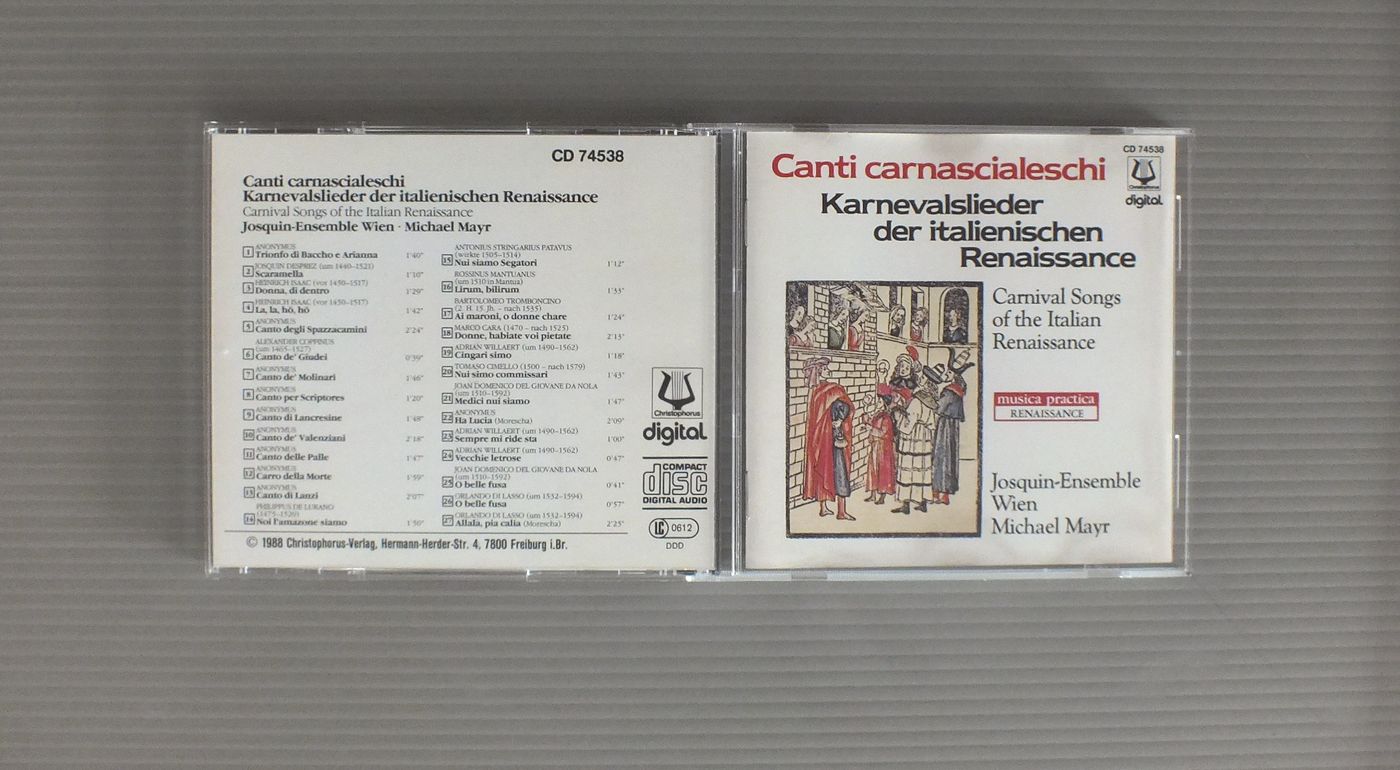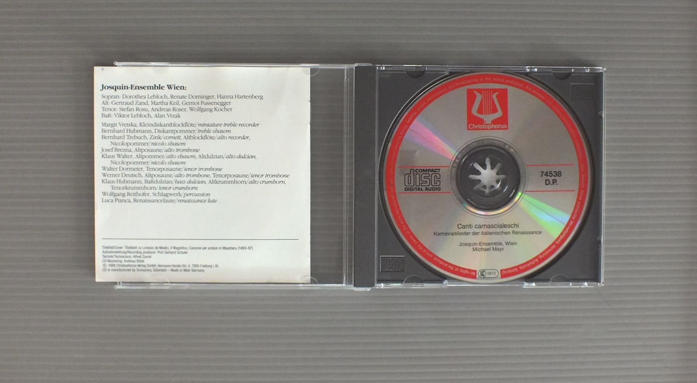 MICHAEL MAYR-JOSQUIN-ENSEMBLE WIEN/CARNIVAL SONGS OF THE ITALIAN RENAISSANCE CD74538 製造国:独盤 / Media:CD外観:EX-盤の状態:EX+ 価格(税込):¥4,400 送料 7inch:定形外郵便 360円~LP:定形外郵便 660円~送料は、注文の最終画面で確認頂けます。 > > MICHAEL MAYR-JOSQUIN-ENSEMBLE WIEN/CARNIVAL SONGS OF THE ITALIAN RENAISSANCE 外観 (EX-)特記事項:ブックレット表裏表紙によごれが少し。外観EX-の共通説明:ダメージ軽度~多少。 中古品としては普通の状態。シミ、ヨゴレ、スレなど軽く~多少。 盤の状態 (EX+)特記事項:薄いスリキズが少し。きれいな感じ。盤EX+の共通説明:盤面の極薄いスリキズ、スレ少し程度 音に出そうなものは無いように見える(極軽微なソフトティック音は除く)。 Tweet それぞれの画像をクリックすると、大きい写真が見られます こちらの商品もお勧めです 990円 BEAUX ARTS TRIOボザール・トリオ / BEETHOVEN - PIANO TRIO NO.7ベートーヴェン - ピアノ三重奏曲第7番 1,320円 ACHENBACH - DAS HEIDELBERGER KAMMERORCHESTERアッヘンバッハ - ハイデルベルグ室内管弦楽団 / BACH - MESSE IN H-MOLLバッハ - ロ短調ミサ曲
