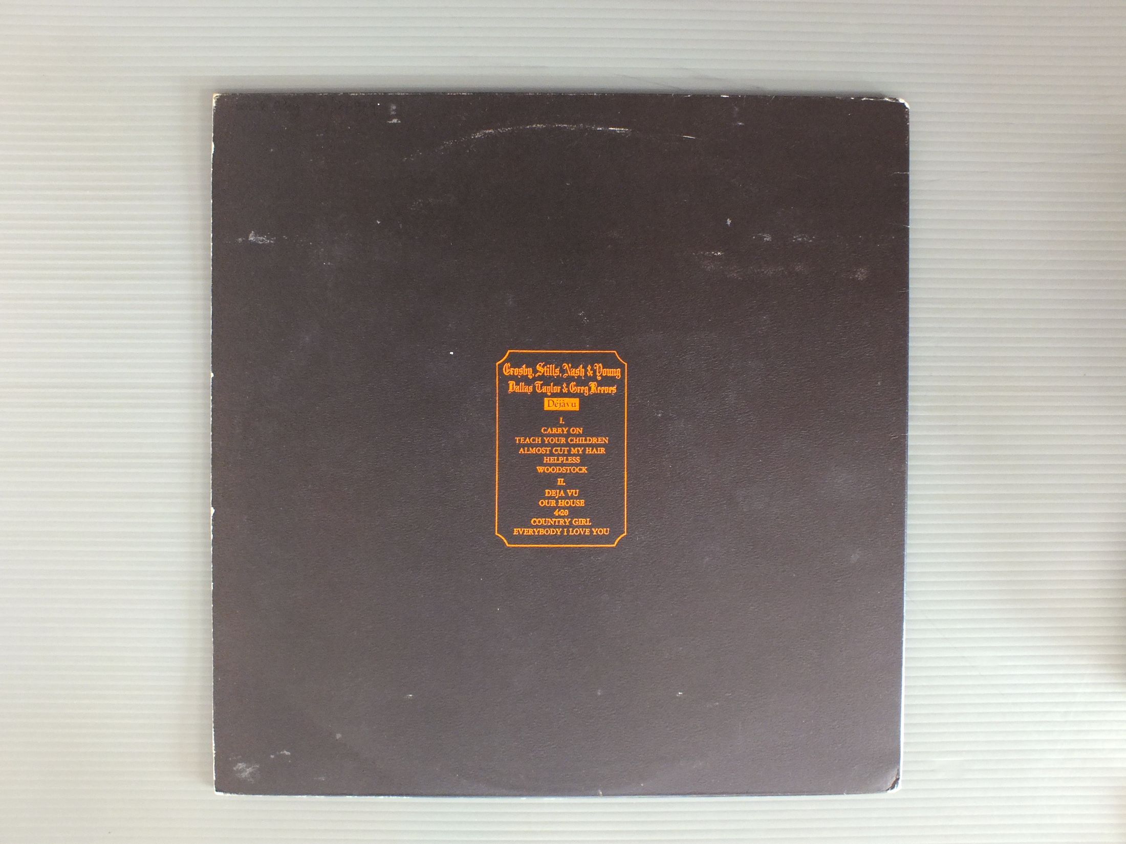 CROSBY STILLS NASH & YOUNG/DEJA VU 2401001 製造国:英国盤 / Media:LPMatrix:A▽1 B▽1外観:EX盤の状態:EX 価格(税込):¥9,900(売約済) 送料 7inch:定形外郵便 360円~LP:定形外郵便 660円~送料は、注文の最終画面で確認頂けます。 > > CROSBY STILLS NASH & YOUNG/DEJA VU 外観 (EX)特記事項:表裏ジャケ共に粗いエンボス仕様。底スレやや有り。背スレや上ヘリにもスレ多少有り。表ジャケ背下付近にキズ。表ジャケは横スレ多少有り。よごれやスリキズ等は少なめと思います。裏ジャケにレコードリングスレ等スレ。よごれが少し。左上隅に書き込み有り。見開きはスレやよごれは少ない印象。外観EXの共通説明:ダメージが限定的。中古品としては保存状態がよい方。シミ、ヨゴレ、スレ 少し~軽度。 盤の状態 (EX)特記事項:薄いスリキズが少し。きれいな状態です。少し聴いてますが音もしっかりしていて細かい音も良く出ていると思います。曲間もチリはあまり無い感じ。良いと思います。盤EXの共通説明:盤面のスリキズが薄いものが少し~軽度 音に出そうなものは無いように見える(軽微なソフトティック音は除く)。 Tweet それぞれの画像をクリックすると、大きい写真が見られます こちらの商品もお勧めです 6,050円 ALLMAN BROTHERS BAND / WIPE THE WINDOWS 7,700円 BLUE JAG / SAME TITLE 4,950円 BIG BROTHER AND THE HOLDING CO / BE A BROTHER 2,750円 RASCALS / TIME PEACE RASCALS GREATEST HITS 5,500円 HUMIMGBIRD / HUMIMNGBIRD 9,900円 BIG BROTHER AND HOLDING COMPAMY / SAME TITLE / MONO 4,400円 AREA CODE 615 / TRIP IN THE COUNTRY