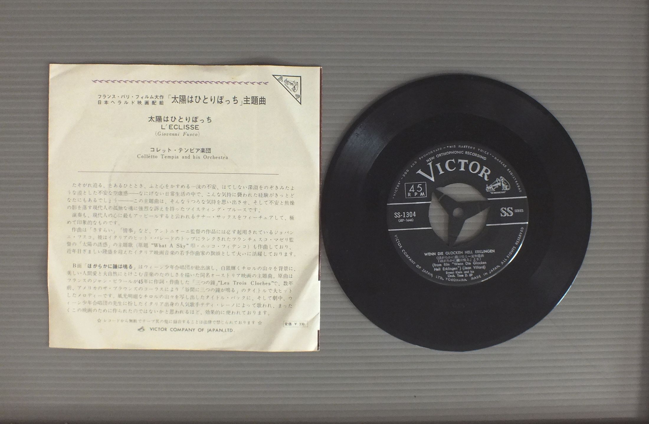 L`ECLISSEアラン・ドロン/COLLETTO TEMPIA AND HIS ORCHESTRA太陽はひとりぼっち SS1304 製造国:日本盤 / Media:7inch外観:EX盤の状態:EX- 価格(税込):¥550 送料 7inch:定形外郵便 360円~LP:定形外郵便 660円~送料は、注文の最終画面で確認頂けます。 > > L`ECLISSE/COLLETTO TEMPIA AND HIS ORCHESTRA 外観 (EX)特記事項:ヨレ有り。 外観EXの共通説明:ダメージが限定的。中古品としては保存状態がよい方。シミ、ヨゴレ、スレ 少し~軽度。 盤の状態 (EX-)特記事項:薄いスリキズ・細かい表面スレ軽くある感じ。全体的には殆どが軽微なものの様子です。盤EX-の共通説明:盤面のスリキズが多少有り。音に出そうなものは殆ど無いように見える~さほど気にならないぐらいの軽いプチ数カ所程度。 Tweet それぞれの画像をクリックすると、大きい写真が見られます こちらの商品もお勧めです 1,320円 JERRY GOLDSMITHジェリー・ゴールドスミス / STAR TREK THE MOTION PICTUREスター・トレック 1,320円 無声映画鑑賞会 / おお活動大写真 1,320円 MORTON GOULDモートン・グールド / SOUND TRACK HOLOCAUST映画ホロコースト 550円 YUJIRO ISHIHARA石原裕次郎 / SOUND TRACK FROM NIKKATSU FILM想い出のスクリーン(日活映画サウンドトラックより) 880円 TV SOUND TRACK2大刑事ドラマ / ORETACHINO KUNSHO俺たちの勲章-太陽にほえろ ! テレビ主題曲集 1,210円 JOHN BARRYジョン・バリー / 10th ANNIVERSARY JAMES BOND ALBUM映画007 スーパー・パック 880円 JOHN ADDISONジョン・アディスン / SOUNDTRACK BRIDGE TOO FAR映画 遠すぎた橋 770円 VANGELISヴァンゲリス / CHARIOTS OF FIREチャリオッツ・オブ・ファイアー