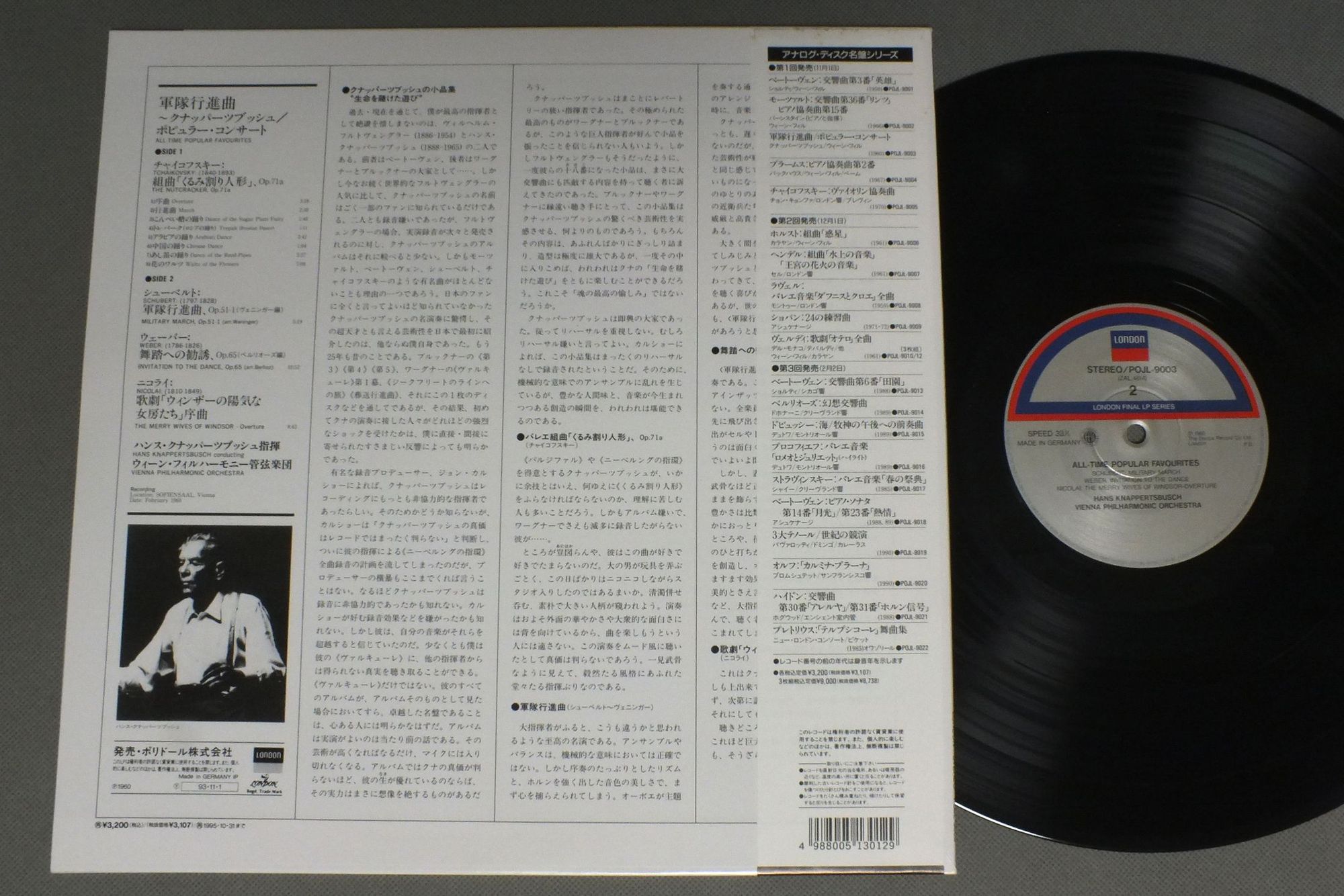 KNAPPERTSBUSCH - VIENNA PHILHARMONIC ORCHクナッパーツブッシュ - ウィーン・フィル/ALL TIME POPULAR FAVOURITES ( HEAVY VINYL )ポピュラー・コンサート ( 超重量盤 ) POJL9003 製造国:日本盤 / Media:LP外観:EX+盤の状態:EX帯:EX 価格(税込):¥1,980(売約済) 送料 7inch:定形外郵便 360円~LP:定形外郵便 660円~送料は、注文の最終画面で確認頂けます。 > > KNAPPERTSBUSCH - VIENNA PHILHARMONIC ORCH/ALL TIME POPULAR FAVOURITES ( HEAVY VINYL ) 外観 (EX+)特記事項:特記なし。外観EX+の共通説明:中古としては美品、一見してきれいでダメージが軽微。シミ、ヨゴレ、スレ有っても僅か~少し。 盤の状態 (EX)特記事項:薄いスリキズ・スレ軽くある感じ。軽微なものの様子です。盤EXの共通説明:盤面のスリキズが薄いものが少し~軽度 音に出そうなものは無いように見える(軽微なソフトティック音は除く)。 帯の状態 (EX):シミやよごれ有り。 その他:超重量盤 Tweet それぞれの画像をクリックすると、大きい写真が見られます こちらの商品もお勧めです 1,320円 YASUHIKO IIYOSHI飯吉靖彦-佼成吹奏楽団 / BAND FESTIVALバンド・フェスティバル 990円 SCHURICHT - THE BAYRISCHEN RUNDFUNKSシューリヒト - バヴァリア放送交響楽団 / WAGNER - RIENZI ワーグナー - 歌劇リエンチ序曲 990円 SZELLセル / MOZART- SYM.S NOS28 & 33 etcモーツァルト-交響曲第28番 & 第33番 他 990円 MONTEUXモントゥー / TCHAIKOVSKY SYM. N5チャイコフスキー 交響曲 第5番 990円 HAEBLER - MELLES - PRO MUSICA ORCH VIENNAイングリッド・ヘブラー - メッレス - プロムジカ管弦楽団 / MOZART - PIANO CONC. NO19 & NO20モーツァルト - ピアノ協奏曲第19番第20番 1,320円 BOHM - VIENNA PHIL.ベーム - ウィーン・フィル / BRUCKNER - SYMPHONY NO3I WAGNERブルックナー交響曲第3番 (ワーグナー) 990円 KARAJANカラヤン / BEETHOVEN SYM. NO5ベートーヴェン 交響曲第5番-シューベルト 交響曲第8番 未完成 1,430円 FURTWANGLERフルトヴェングラー / BRUCKNER SYM. NO4 `ROMANTIC`ブルックナー 交響曲第4番 `ロマンティック`