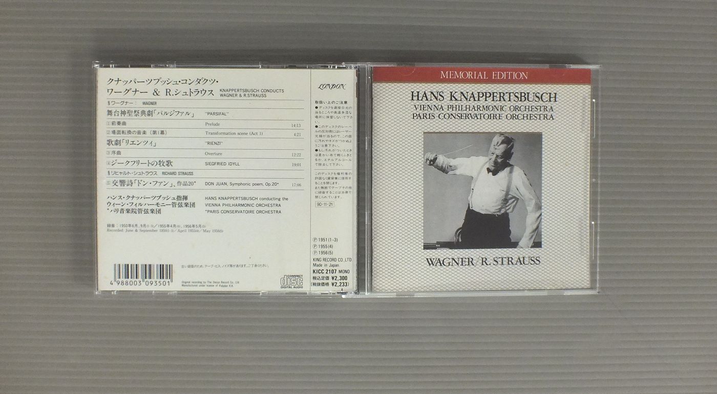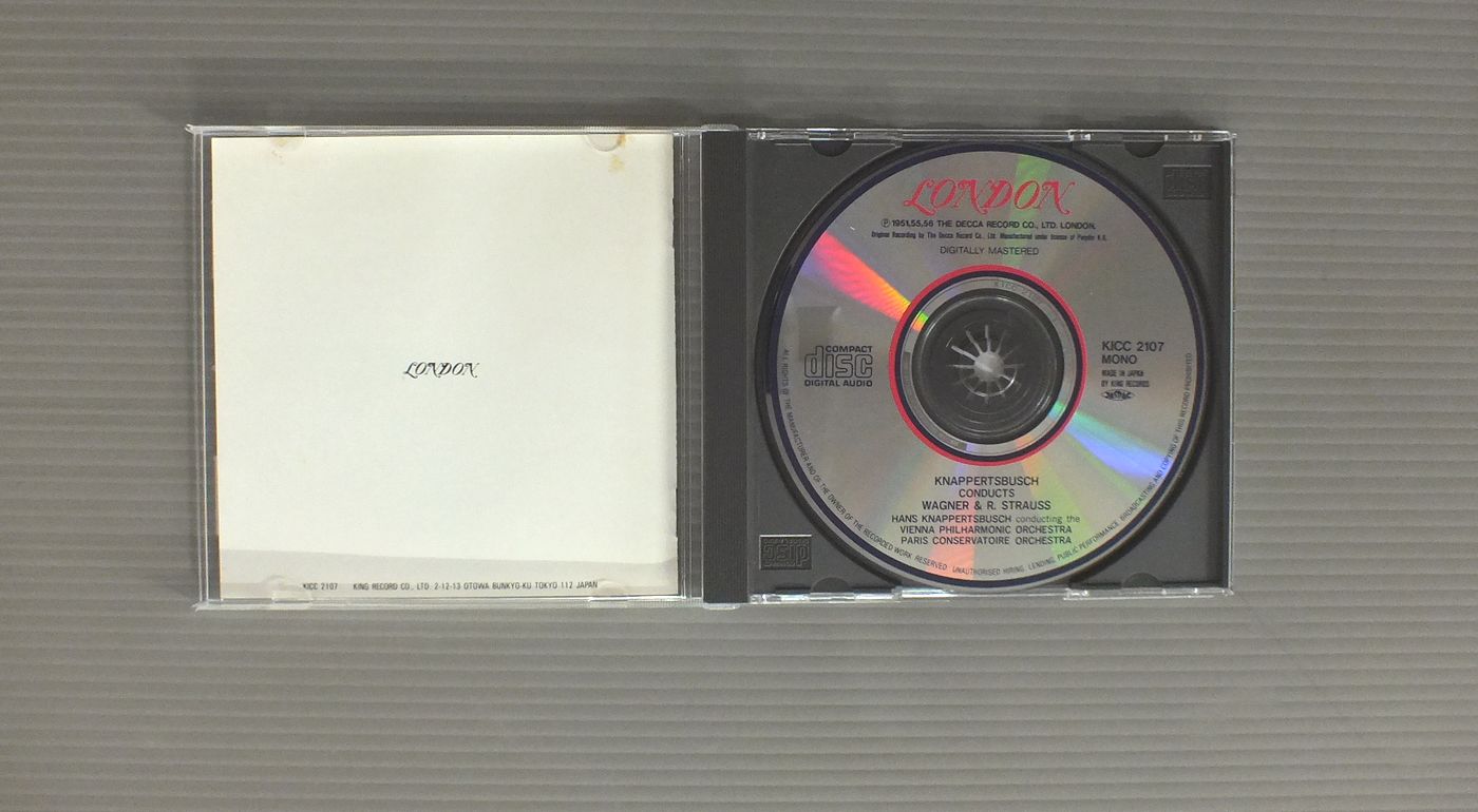 KNAPPERTSBUSCH - VIENNA PHILHAMONIC ORCH.クナッパーツブッシュ - ウィーン・フィル/KNAPPERTSBUSCH CONDUCTS WAGNER & R.STRAUSSクナッパーツブッシュ - ワーグナー& R.シュトラウス KICC2107 製造国:日本盤 / Media:CD外観:VG+盤の状態:EX 価格(税込):¥550 送料 7inch:定形外郵便 360円~LP:定形外郵便 660円~送料は、注文の最終画面で確認頂けます。 > > KNAPPERTSBUSCH - VIENNA PHILHAMONIC ORCH./KNAPPERTSBUSCH CONDUCTS WAGNER & R.STRAUSS 外観 (VG+)特記事項:裏のカードやブックレットにシミ有り。外観VG+の共通説明:ダメージやや有り。シミ、ヨゴレ、スレなど多少~やや多め。 盤の状態 (EX)特記事項:あまりスリキズの無いきれいな状態。盤EXの共通説明:盤面のスリキズが薄いものが少し~軽度 音に出そうなものは無いように見える(軽微なソフトティック音は除く)。 Tweet それぞれの画像をクリックすると、大きい写真が見られます こちらの商品もお勧めです 2,860円 JOCHUM - CHOR UND ORCHESTER DES BAYERISCHEN RUNDFUNKSヨッフム - バイエルン放送交響楽団 / HAYDN - MISSA SANCTAE CAECILIAEハイドン - チェチリアのミサ 990円 JOCHUM - CONCERTGEBOUW ORCHESTRAヨッフム - アムステルダム・コンセルトヘボウ管弦楽団 / BEETHOVEN - SYMPHONY NO5ベートーヴェン - 交響曲第5番 運命 2,200円 SOLTI + CHICAGO SYMPHONY / BEETHOVEN NINE SYMPHONIES 9LP BOX 990円 WIENNA PHILHARMONIC WIND GROUPウィーン・フィルハーモニー管弦楽団グループ / MOZART - DIVERTOMENTO モーツァルト - 喜遊曲 2,200円 BOULT + LONDON PHILHARMONIC ORCHESTRA / VAUGHAN WILLIAMS - THE NINE SYMPHONIES 9 LP BOX 1,540円 BEECHAM - ROYAL PHILHARMONIC ORCHESTAビーチャム - ロイヤル・フィルハーモニー管弦楽団 / MOZART - SYMPHONY NO41 JUPITERモーツアルト交響曲第41番ジュピター 2,750円 FURTWANGLER / WARGNER 5枚組 1,540円 HAGER - MOZAARTEUM ORCHESTER SALZBURGレオポルト・ハーガー - ザルツブルク・モーツァルテウム管弦楽団 / MOZART - THAMOS KING OF EGYPT