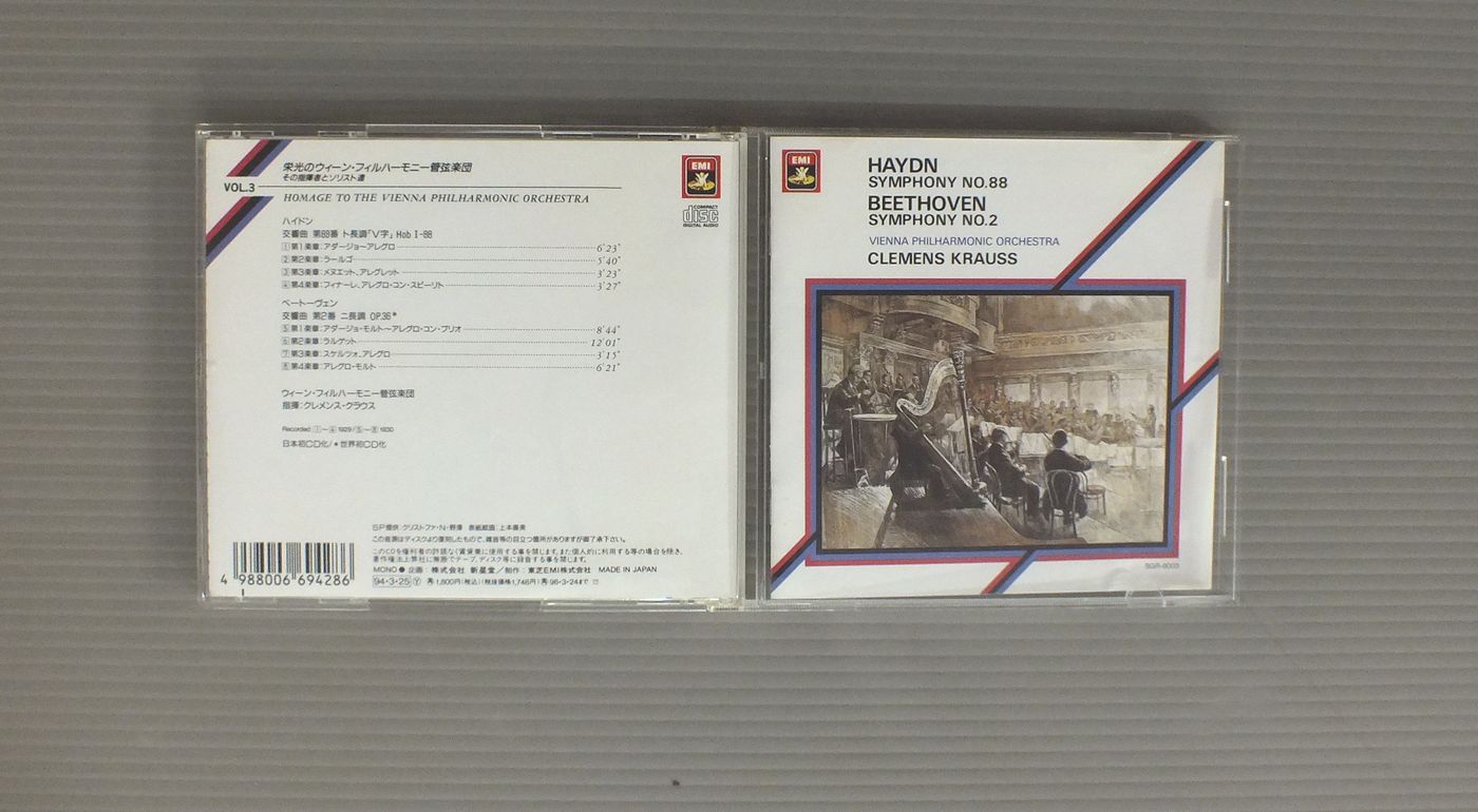 KRAUSS - VIENNA PHILHARMONIC ORCHクラウス - ウィーン・フィル/HAYDON - SYM NO88 & BEETHOVEN - SYM NO2ハイドン 交響曲第88番 & ベートーヴェン 交響曲第2番 SGR8003 製造国:日本盤 / Media:CD外観:EX盤の状態:EX+帯:EX+ 価格(税込):¥550 送料 7inch:定形外郵便 360円~LP:定形外郵便 660円~送料は、注文の最終画面で確認頂けます。 レコード検索 > SOUL > KRAUSS - VIENNA PHILHARMONIC ORCH/HAYDON - SYM NO88 & BEETHOVEN - SYM NO2 外観 (EX)特記事項:ブックレット裏表紙に僅かにシミ有り。外観EXの共通説明:ダメージが限定的。中古品としては保存状態がよい方。シミ、ヨゴレ、スレ 少し~軽度。 盤の状態 (EX+)特記事項:あまりスリキズの無いきれいな状態。盤EX+の共通説明:盤面の極薄いスリキズ、スレ少し程度 音に出そうなものは無いように見える(極軽微なソフトティック音は除く)。 帯の状態 (EX+):特記無し。 Tweet それぞれの画像をクリックすると、大きい写真が見られます こちらの商品もお勧めです 990円 REINER - CHICAGO SYMPHONY ORCHESTRAライナー - シカゴ交響楽団 / BARTOK - MUSIC FOR STRINGS PERCUSSION AND CELESTAバルトーク - 弦楽器と打楽器とチェレスタのための音楽 1,540円 ENTREMONT - ORMANDY - PHILADELPHIA ORCHESTRAアントルモン - オーマンディ - フィラデルフィア交響楽団 / LISZT - CONCERTO NO1リスト - ピアノ協奏曲第1番 1,540円 BOHM - BERLINER PHILHARMONIKERベーム - ベルリン・フィル / MOZART - SINFONIE CONCERTANTI KV364&297モーツアルト協奏交響曲KV364&297 990円 DURUFLE - PRETRE - LA SOCIETE DES CONCERTS DU CONSERVATOIREデュリュフレ - プレートル - パリ音楽院管弦楽団 / SAINT SAENS - SYMPHONY NO.3サン・サーンス - 交響曲第3番 990円 CLUYTENS - PARIS CONSERVATOIRE ORCH.クリュイタンス - パリ音楽院管弦楽団 / FAURE - REQUIEMフォーレ - レクイエム 2,420円 HIROYUKI IWAKI - THE NHK SYMPHONY ORCHESTRA岩城宏之 - NHK交響楽団 / TOSHIRO MAYUZUMI - BUGAKU黛 敏郎 - バレエ音楽`舞楽` 1,540円 LAWRENCE FOSTER - HOUSTON SYMPHONY ORCHESTRAローレンス・フォスター - ヒューストン交響楽団 / PAUL CHIHARA - SYMPHONY IN CELEBRATIONポール・チハラ - SYMPHONY IN CELEBRATION 1,540円 BOHM - BERLINER PHILHARMONIKERベーム - ベルリン・フィル / R.STRAUSS - TILL EULENSPIEGELリヒャルト・シュトラウス - ティル・オイレンシュピーゲルの愉快ないたずら