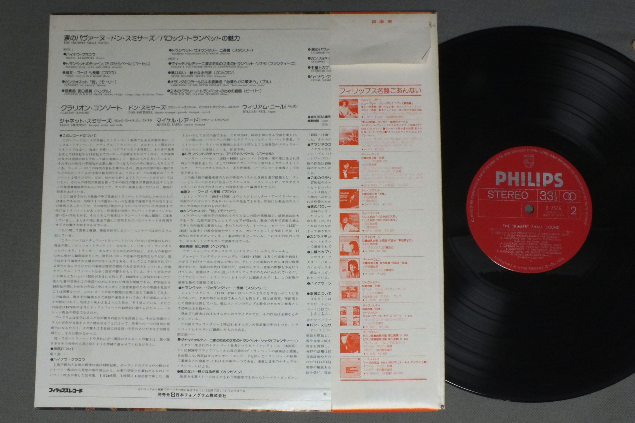 DON SMITHERS - CLARION CONSORTドン・スミサーズ - クラリオン・コンソート/TRUMPET SHALL SOUND涙のパヴァーヌ (バロック・トランペットの魅力) X7526 製造国:日本盤 / Media:LP盤の状態:EX+帯:EX- 価格(税込):¥990 送料 7inch:定形外郵便 360円~LP:定形外郵便 660円~送料は、注文の最終画面で確認頂けます。 > > DON SMITHERS - CLARION CONSORT/TRUMPET SHALL SOUND 盤の状態 (EX+)特記事項:薄いスリキズ・スレ少し。一見してきれいな状態です。盤EX+の共通説明:盤面の極薄いスリキズ、スレ少し程度 音に出そうなものは無いように見える(極軽微なソフトティック音は除く)。 帯の状態 (EX-):シミやよごれ、切れ有り。 Tweet それぞれの画像をクリックすると、大きい写真が見られます こちらの商品もお勧めです 1,320円 BRENDEL - CLEVELAND QUARTETブレンデル - クリーヴランド弦楽四重奏団員 / SCHUBERT - PIANO QUINTET TROUTシューベルト - ピアノ五重奏曲 ます 990円 VIENNA OCTETウィーン八重奏団 / MENDELSSOHN OCTET OP20-SEXTET OP110メンデルスゾーン 八重奏曲-六重奏曲 990円 BERLINER PHILHARMONIKERベルリン・フィルハーモニー管楽アンサンブル / MOZART SERENADE K361 FOR 13 WIND INSTRUMENTSモーツァルト 13管楽器のためのセレナーデ 990円 VIENNA KONZERTHAUS Qウィーン・コンツェルトハウス四重奏団-ウィーン・フィルハーモニー木管グループ-ヨーゼフ・ヘルマン 他 / MOZART-DIVERTIMENTO NO17モーツァルト-ディヴェルティメント 第17番 770円 RAMPALランパル/ラスキーヌ / MELODIES JAPONAISES日本の旋律 990円 SIMON PRESTON - MARRINER - ACADEMY OF ST. MARTIN - IN - THE - FIELDSサイモン・プレストン ‐ マリナー - アカデミー室内管弦楽団 / VIVALDI - FOUR SEASONSヴィヴァルディ四季 990円 CAMERATA BERNカメラータ・ベルン / UNICO WILHELM - 6 CONCERTI ARMONICIウーニコ・ヴィルヘルム - 6つの合奏協奏曲 1,320円 RENATA TARRAGOレナータ・タラゴ-アレクサンドル・ラゴヤ 他 / RODRIGO-ARANJUEZ CONC.ロドリーゴ-アランフエス協奏曲-禁じられた遊び ギター名曲アルバム