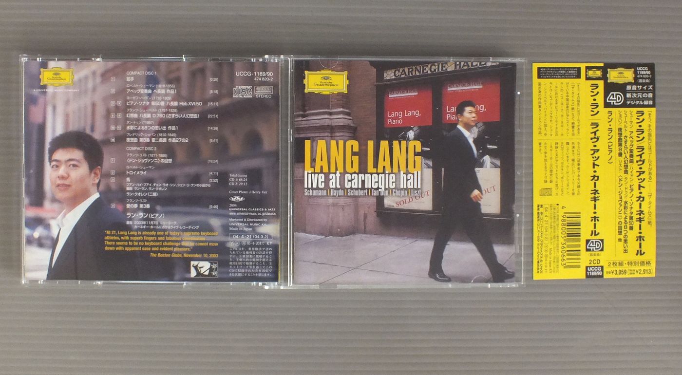 LANG LANGラン・ラン/LIVE AT CARNEGIE HALLライヴ・アット・カーネギー・ホール UCCG1189 90 製造国:日本盤 / Media:CD外観:EX+盤の状態:EX-帯:EX+ 価格(税込):¥1,980 送料 7inch:定形外郵便 360円~LP:定形外郵便 660円~送料は、注文の最終画面で確認頂けます。 > > LANG LANG/LIVE AT CARNEGIE HALL 外観 (EX+)特記事項:特記無し。コンディションリストを参照。外観EX+の共通説明:中古としては美品、一見してきれいでダメージが軽微。シミ、ヨゴレ、スレ有っても僅か~少し。 盤の状態 (EX-)特記事項:薄いスリキズ多少有り。盤EX-の共通説明:盤面のスリキズが多少有り。音に出そうなものは殆ど無いように見える~さほど気にならないぐらいの軽いプチ数カ所程度。 帯の状態 (EX+):特記無し。コンディションリストを参照。 Tweet それぞれの画像をクリックすると、大きい写真が見られます こちらの商品もお勧めです 1,100円 ASHKENAZYアシュケナージ / CHOPIN - PIANO WORKSショパン - 夜想曲 990円 CZIFFRAシフラ / LISZT RECITALリスト リサイタル 990円 ASHKENAZYアシュケナージ / BEETHOVEN - PIANO SONATA NO.1ベートーヴェン - ピアノソナタ第1番 990円 GARRICK OHLSSONギャリック・オールソン / CHOPIN - POLONAISESショパン - ポロネーズ 990円 WEISSENBERGワイセンベルク / BACH - PARTITAS VOL.2バッハ - パルティータ第2番5番6番 990円 KARL RICHTERカール・リヒター / BACH - TOCCATA AND FUGUEバッハ - トッカータとフーガ 990円 MENUHIN - BATH FESTIVAL CEMBER ORCHESTRAメニューイン - バース音楽祭管弦楽団 / BACH - SUITE NO2&3バッハ - 管弦楽組曲第2番第3番 990円 SVIATOSLAV RICHTERスヴァトスラフ・リヒテル / RICHTER PIANO RECITALリヒテル - ピアノ・リサイタル
