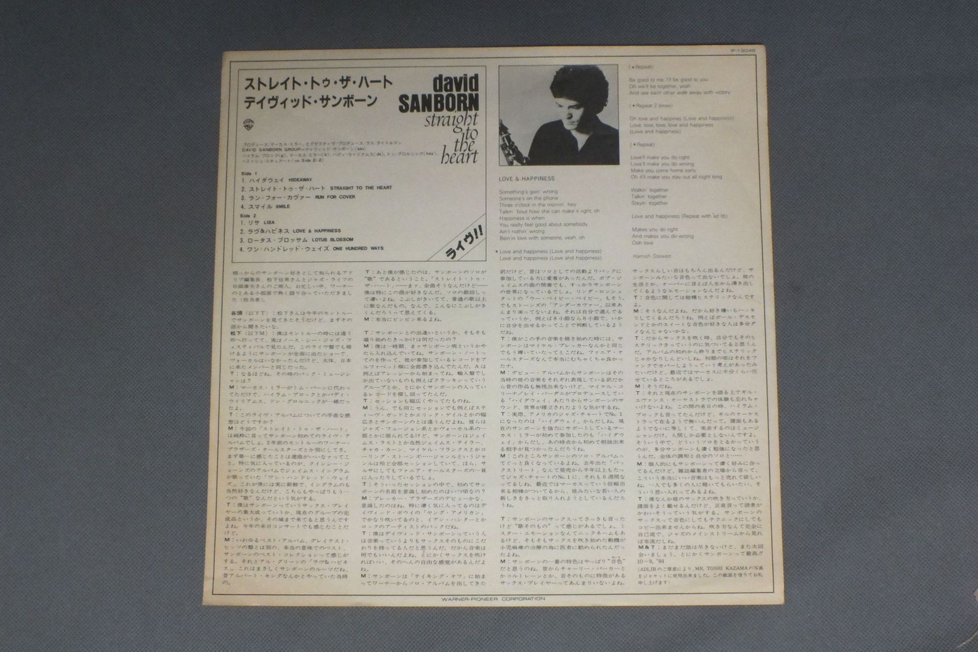 DAVID SANBORNデイヴィッド・サンボーン/STRAIGRT TO THE HEARTストレイト・トゥ・ザ・ハート P13045 製造国:日本盤 / Media:LP外観:EX-盤の状態:EX 価格(税込):¥880(売約済) 送料 7inch:定形外郵便 360円~LP:定形外郵便 660円~送料は、注文の最終画面で確認頂けます。 > > DAVID SANBORN/STRAIGRT TO THE HEART 外観 (EX-)特記事項:ヘリスレや角スレ有り。表ジャケにスレやスリキズ。裏ジャケにシミ有り。外観EX-の共通説明:ダメージ軽度~多少。 中古品としては普通の状態。シミ、ヨゴレ、スレなど軽く~多少。 盤の状態 (EX)特記事項:薄いスリキズ・スレ軽くある感じ。軽微なものの様子です。盤EXの共通説明:盤面のスリキズが薄いものが少し~軽度 音に出そうなものは無いように見える(軽微なソフトティック音は除く)。 Tweet それぞれの画像をクリックすると、大きい写真が見られます こちらの商品もお勧めです 1,210円 AL DI MEOLAアル・ディ・メオラ / SPLEMDIDO HOTELスプレンディド・ホテル 770円 TOM SCOTTトム・スコット / INTIMATE STRANGERSインティメイト・ストレンジャー 1,210円 GEORGE BENSONジョージ・ベンソン / G.B.BOOKG・B・ブック 770円 STANLEY JORDANスタンリー・ジョーダン / MAGIC TOUCHマジック・タッチ 1,210円 RON CARTERロン・カーター / THE MAN WITH THE BASS.RON CARTERザ・マン・ウィズ・ザ・ベース ロン・カーター 770円 SHAKATAKシャカタク / DRIVIN`HARDトワイライト・ドライヴィン 990円 BILLY COBHAMビリー・コブハム / SHABAZZシャバズ 770円 JEAN-LUC PONTYジャン・リュック・ホンティ / OPEN MINDオープン・マインド