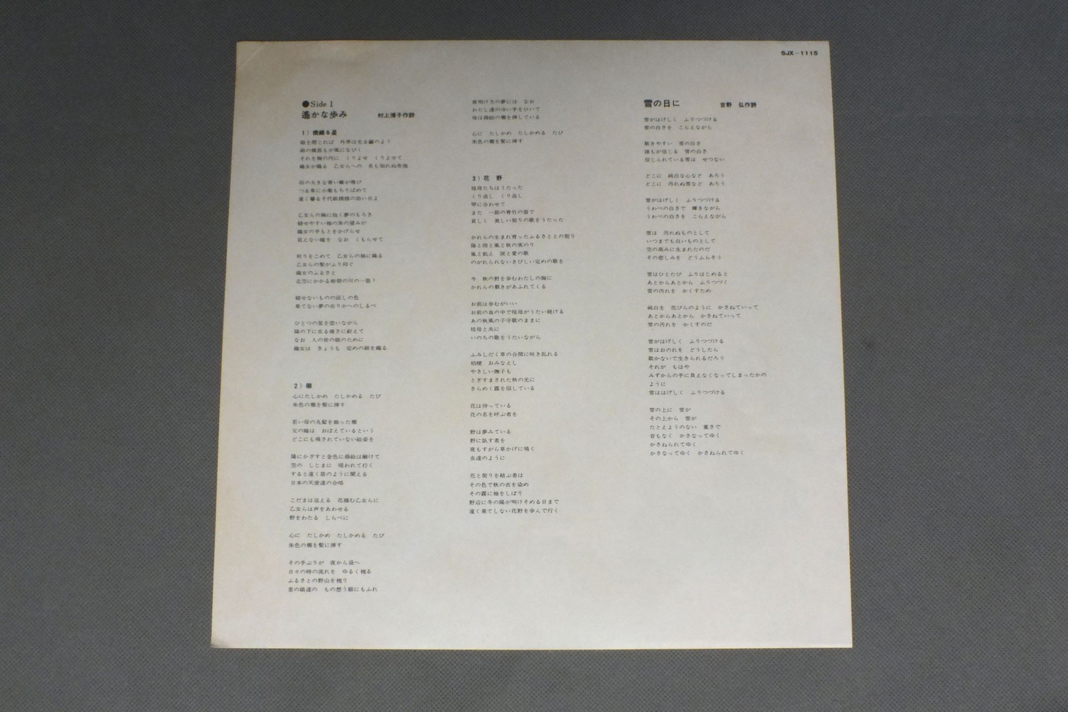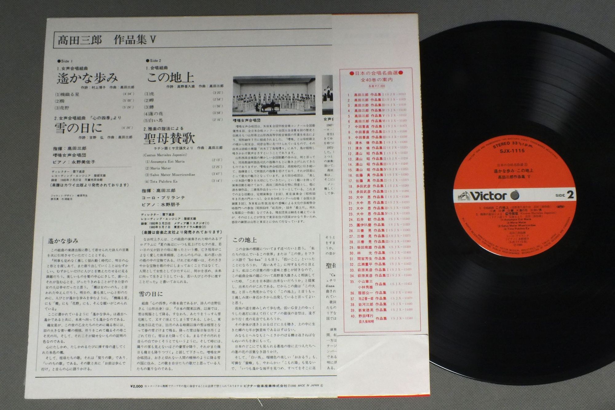 SABURO TAKADA高田三郎 - 嚶鳴女声合唱団 - コーロ・ブリランテ/WORKS OF SABURO TAKADA高田三郎作品集5 (遙かな歩み-雪の日に) SJX1115 製造国:日本盤 / Media:LP外観:EX盤の状態:EX帯:EX 価格(税込):¥1,320 送料 7inch:定形外郵便 360円~LP:定形外郵便 660円~送料は、注文の最終画面で確認頂けます。 > > SABURO TAKADA/WORKS OF SABURO TAKADA 外観 (EX)特記事項:よごれ、スレ等少ないきれいな状態です。外観EXの共通説明:ダメージが限定的。中古品としては保存状態がよい方。シミ、ヨゴレ、スレ 少し~軽度。 盤の状態 (EX)特記事項:多少薄いスリキズ・スレ軽くある感じ。殆どが軽微なものの様子です。盤EXの共通説明:盤面のスリキズが薄いものが少し~軽度 音に出そうなものは無いように見える(軽微なソフトティック音は除く)。 帯の状態 (EX):退色有り。 Tweet それぞれの画像をクリックすると、大きい写真が見られます こちらの商品もお勧めです 1,320円 KARAJAN - VIENNA PHILHARMONIC ORCHESTRAカラヤン - ウィーン・フィル / PUCCINI - TOSCA HIGHLIGHTSプッチーニ - トスカ ハイライツ 2,860円 KARAJAN - VIENNA PHIL.カラヤン - ウィーン・フィル / STRAUSS - SALOME 2LP BOXシュトラウス - サロメ 2ま 1,320円 MICHIKO ARA荒道子 / ARIE ANTICHE ITALIANEイタリア古典歌曲集`?` 愛の喜びは-荒 道子 990円 FRITZ LEHMANN - KREBS - FISCHER-DIESKAU etcフリッツ・レーマン - クレップス - フィッシャーディスカウ / BACH - CHRIST LAG IN TODESBANDENバッハ - 教会カンタータ キリストは死のとりことなり給う 1,870円 CLUYTENS - VIENNA PHIL.クリュイタンス - ウィーン・フィル / HUMPERDINCK - HANSEL UND GRETEL 2LP BOXフンパーディンク - ヘンゼルとグレーテル 2枚組 880円 HANS HOTTERハンス・ホッター / SCHUBERT`SCHWANENGESANG`-SONG CYCLEシューベルトー`白鳥の歌`全曲 1,650円 TEIKO YANAGUI-KAZUKO NAGATOMI柳貞子-永冨和子 / CANCIONES DE GRANADOSグラナードス歌曲集 1,320円 TITO SCHIPAティト・スキーパ / ART OF TITO SCHIPAスキーパ名唱集