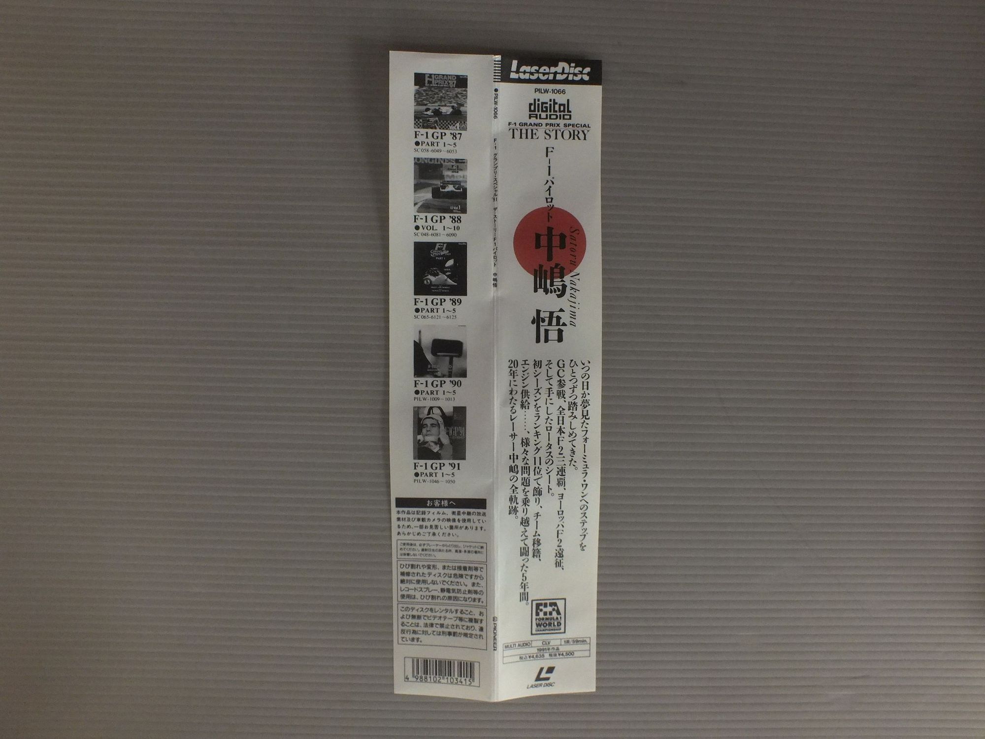 SATORU NAKAJIMA etc中島悟 他/F-1 GRAND PRIX SPECIAL F-1 グランプリ・スペシャル `91 PILW1066 製造国:日本盤 / Media:LD外観:EX+盤の状態:EX帯:EX 価格(税込):¥1,100 送料 7inch:定形外郵便 360円~LP:定形外郵便 660円~送料は、注文の最終画面で確認頂けます。 > > SATORU NAKAJIMA etc/F-1 GRAND PRIX SPECIAL 外観 (EX+)特記事項:よごれ等あまり無いきれいな状態です。外観EX+の共通説明:中古としては美品、一見してきれいでダメージが軽微。シミ、ヨゴレ、スレ有っても僅か~少し。 盤の状態 (EX)特記事項:薄いスリキズ・スレ軽くある感じ。軽微なものが中心です。盤EXの共通説明:盤面のスリキズが薄いものが少し~軽度 音に出そうなものは無いように見える(軽微なソフトティック音は除く)。 帯の状態 (EX):よごれ、スレ、スリキズ、ヨレ等少ないきれいな状態です。 Tweet それぞれの画像をクリックすると、大きい写真が見られます こちらの商品もお勧めです