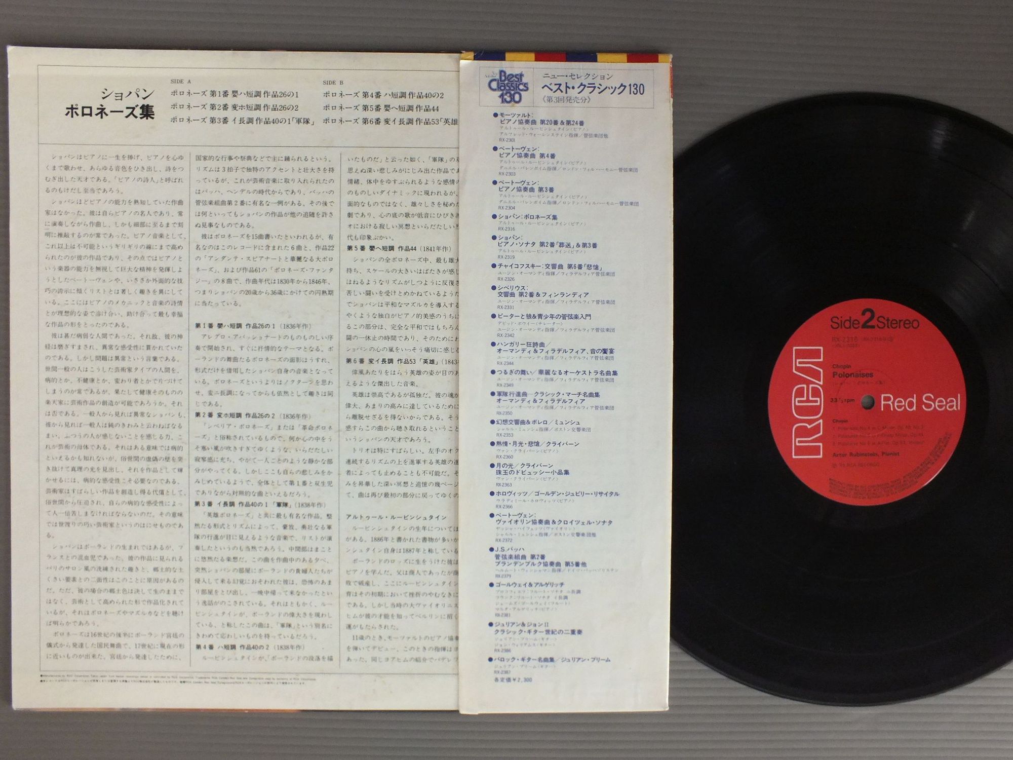 RUBINSSTEINルービンシュタイン/CHOPIN POLONAZESショパン - ボロネーズ集 RX2316 製造国:日本盤 / Media:LP外観:EX-盤の状態:EX-帯:EX- 価格(税込):¥990 送料 7inch:定形外郵便 360円~LP:定形外郵便 660円~送料は、注文の最終画面で確認頂けます。 > > RUBINSSTEIN/CHOPIN POLONAZES 外観 (EX-)特記事項:背スレやヘリスレ、角スレ多少有り。ジャケ表面にシミやよごれ多少有り。外観EX-の共通説明:ダメージ軽度~多少。 中古品としては普通の状態。シミ、ヨゴレ、スレなど軽く~多少。 盤の状態 (EX-)特記事項:薄いスリキズ・細かい表面スレ多少ある感じ。全体的には殆どが軽微なものの様子です。盤EX-の共通説明:盤面のスリキズが多少有り。音に出そうなものは殆ど無いように見える~さほど気にならないぐらいの軽いプチ数カ所程度。 帯の状態 (EX-):シミやよごれ多少有り。切れ有り。 Tweet それぞれの画像をクリックすると、大きい写真が見られます こちらの商品もお勧めです 990円 KEMPFFケンプ / FUR ELISEエリーゼの為に 990円 HOROWITZウラディミール・ホロヴィッツ / SCHUBERT PIANO SONATA IN B-FLAT POSTH IMPROMPTU IN G-FLAT OP90 NO3シューベルト ピアノ・ソナタ 990円 DINU LIPATTIディヌ・リパッティ / PIANO RECITAL VOL6特選集第6集 770円 AURELE NICOLETニコレ / FLUTE RECITALフルート・コンサート 990円 RICHTERスヴィアトスラフ・リヒテル / BEETHOVEN PIANO SONATAS NOS1 & 7べートーヴェン ピアノソナタ第1番 ピアノソナタ第7番 440円 BRENDELアルフレッド・ブレンデル / SHUMANN - FANTASY. シューマン - 幻想曲 他 990円 P.FRANKLペーター・フランクル / DEBUSSY-PIANO MUSIC COMPLETE VOL6ドビュッシー-ピアノ曲全集 第6集 990円 GIESEKINGギーゼキング / MOZART PIANO WORKS VOL8 - 9 VARIATIONS etcモーツァルト ピアノ音楽全集 第8集 9つの変奏曲他