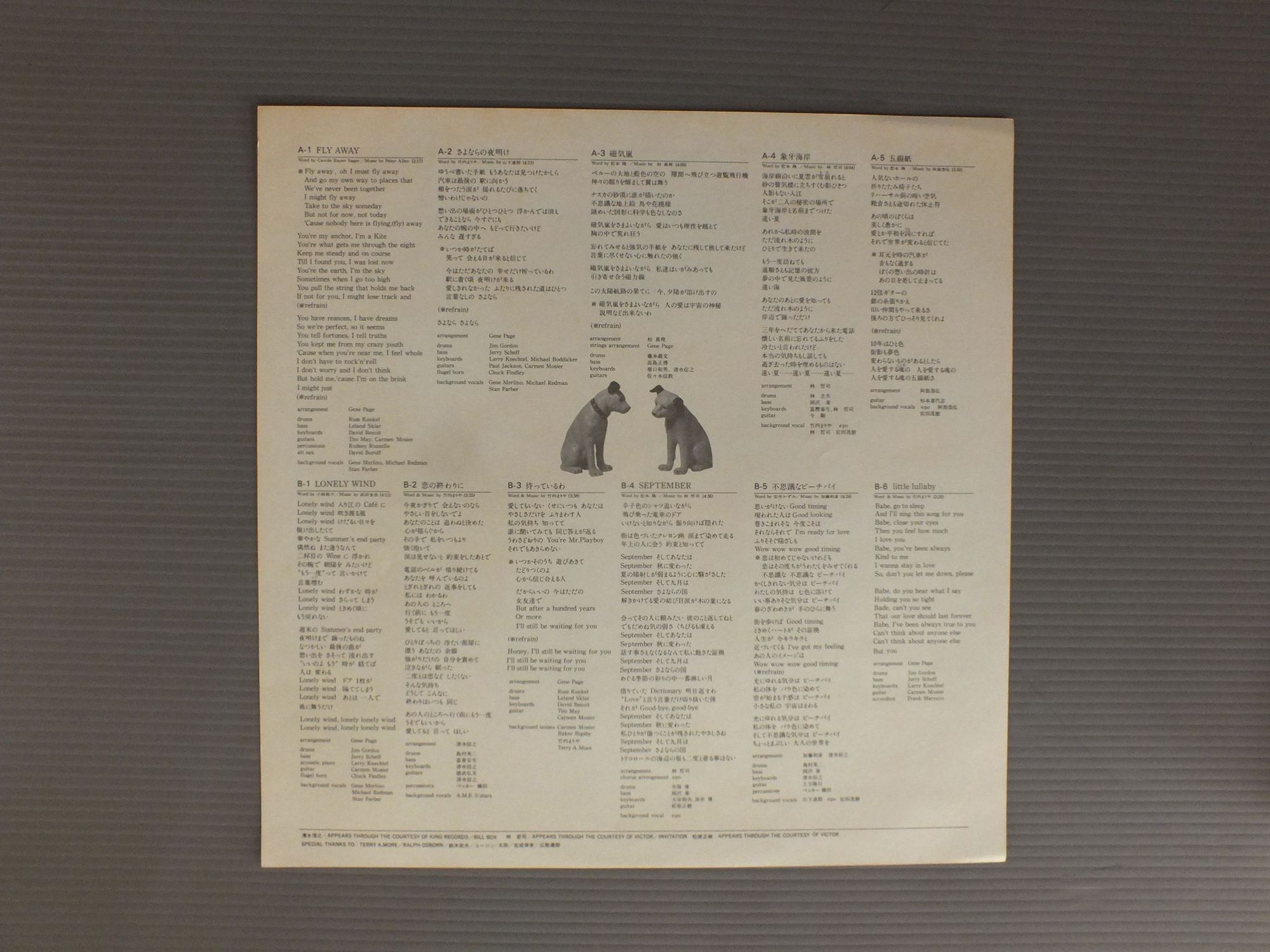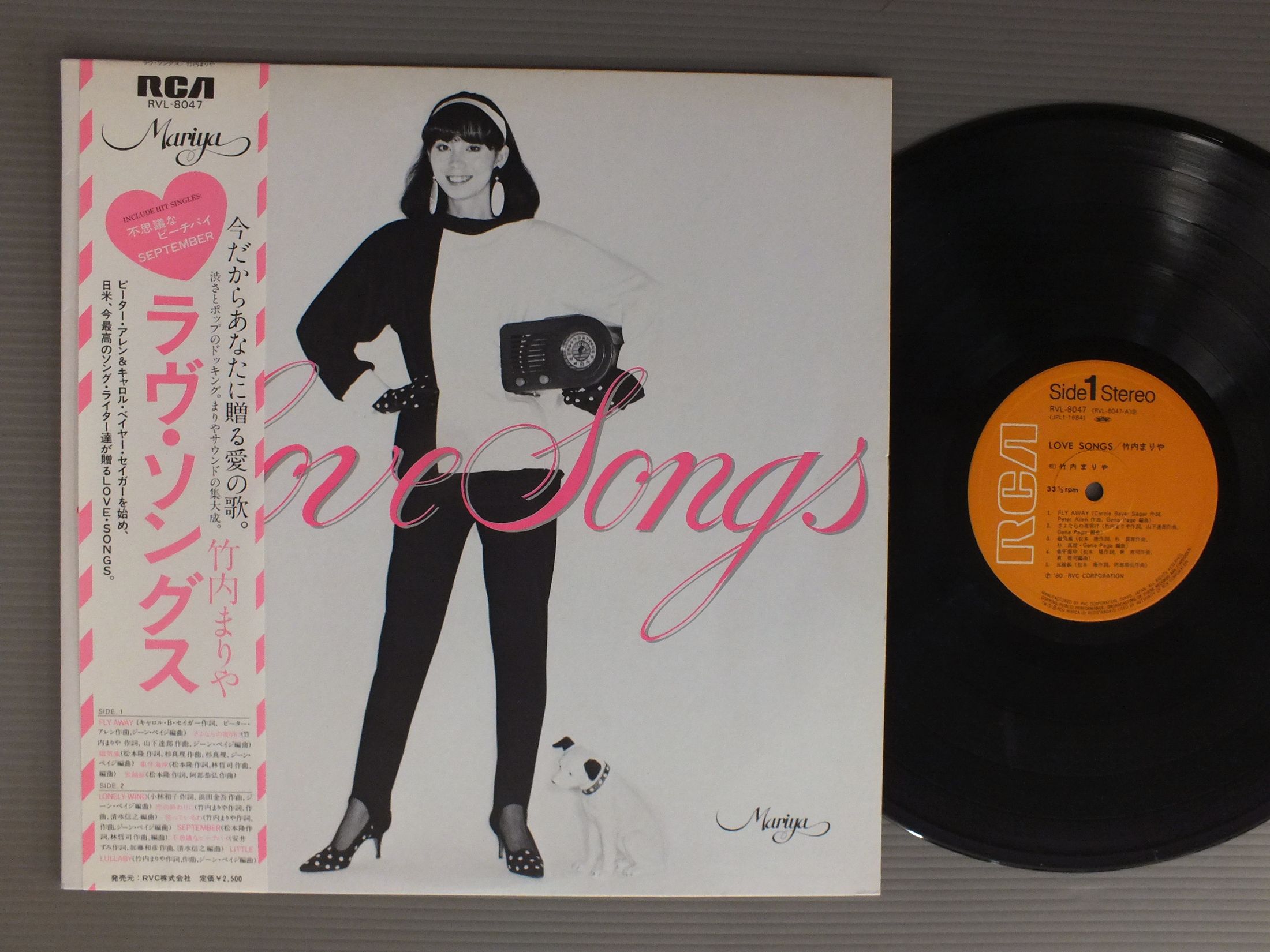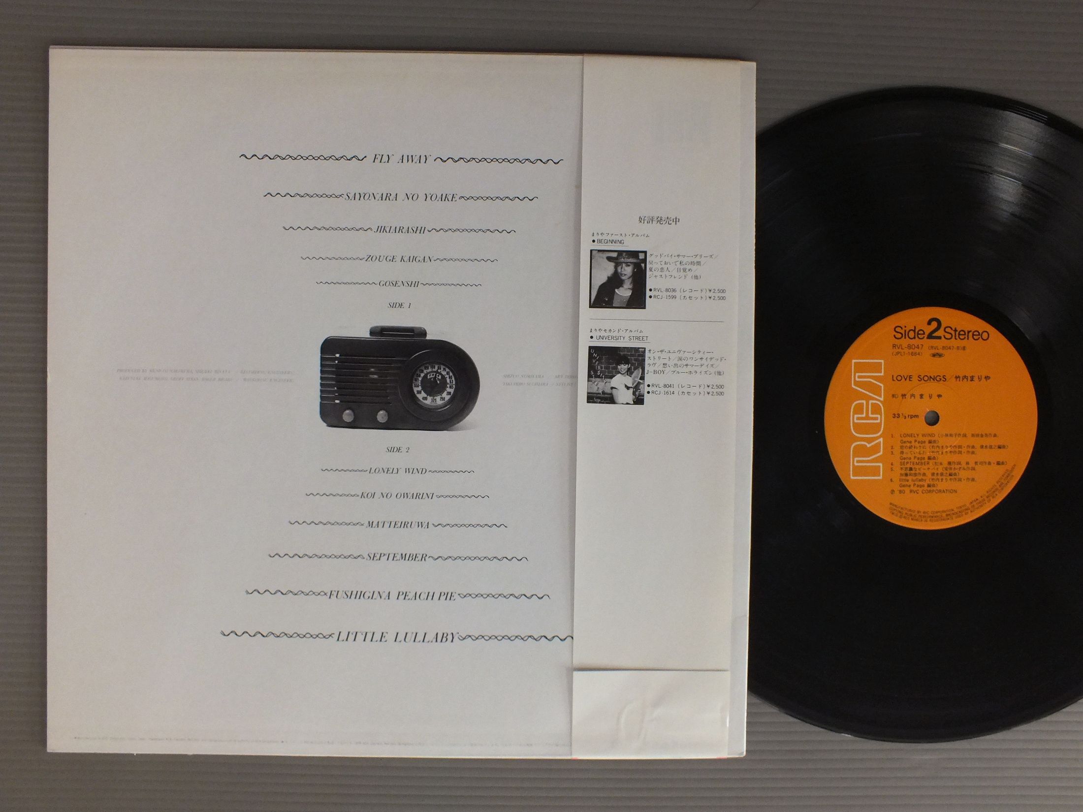 MARIA TAKEUCH竹内まりあ/KLOVE SONGSラブ・ソングス RVL8047 製造国:日本盤 / Media:LP外観:EX盤の状態:EX帯:EX 価格(税込):¥1,320(売約済) 送料 7inch:定形外郵便 360円~LP:定形外郵便 660円~送料は、注文の最終画面で確認頂けます。 > > MARIA TAKEUCH/KLOVE SONGS 外観 (EX)特記事項:ジャケ表面にシミやよごれ少し有り。外観EXの共通説明:ダメージが限定的。中古品としては保存状態がよい方。シミ、ヨゴレ、スレ 少し~軽度。 盤の状態 (EX)特記事項:多少薄いスリキズ・スレ軽くある感じ。殆どが軽微なものの様子です。盤EXの共通説明:盤面のスリキズが薄いものが少し~軽度 音に出そうなものは無いように見える(軽微なソフトティック音は除く)。 帯の状態 (EX):シミやよごれ少し有り。 Tweet それぞれの画像をクリックすると、大きい写真が見られます こちらの商品もお勧めです 770円 KONOMI SASAKI佐々木好(このみ) / KOKORO NO UCHI GA WAAREBA YOI心のうちがわかればいいのに 990円 TULIP - YUMI MATSUTOYA etcチューリップ - ユーミン他 / PROMO ONLY店頭演奏総合試聴盤 1,320円 EIKO SHURI朱里エイコ / ON STAGE 2LP BOXオン・ステージ 2枚組 1,540円 AKIO DOBASHI土橋安騎夫 / CHRONICLESクロニクルズ 1,210円 TULIPチューリップ / LIVE ACT TULIPライヴ !! アクト・チューリップ-渋谷公会堂における実況盤 990円 TADUMI TOYOSHIUMA豊島たづみ / STILL NIGHT 990円 EIKICHI YAZAWA矢沢永吉 / SUPER LIVE BUDOKANスーパー・ライブ日本武道館 1,320円 TAMAKI SAWA沢たまき / DON`T SMOKE IN BEDベッドで煙草を吸わないで