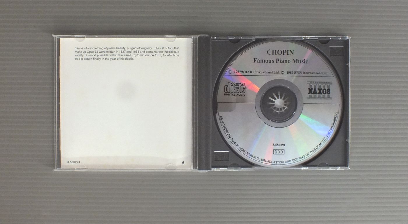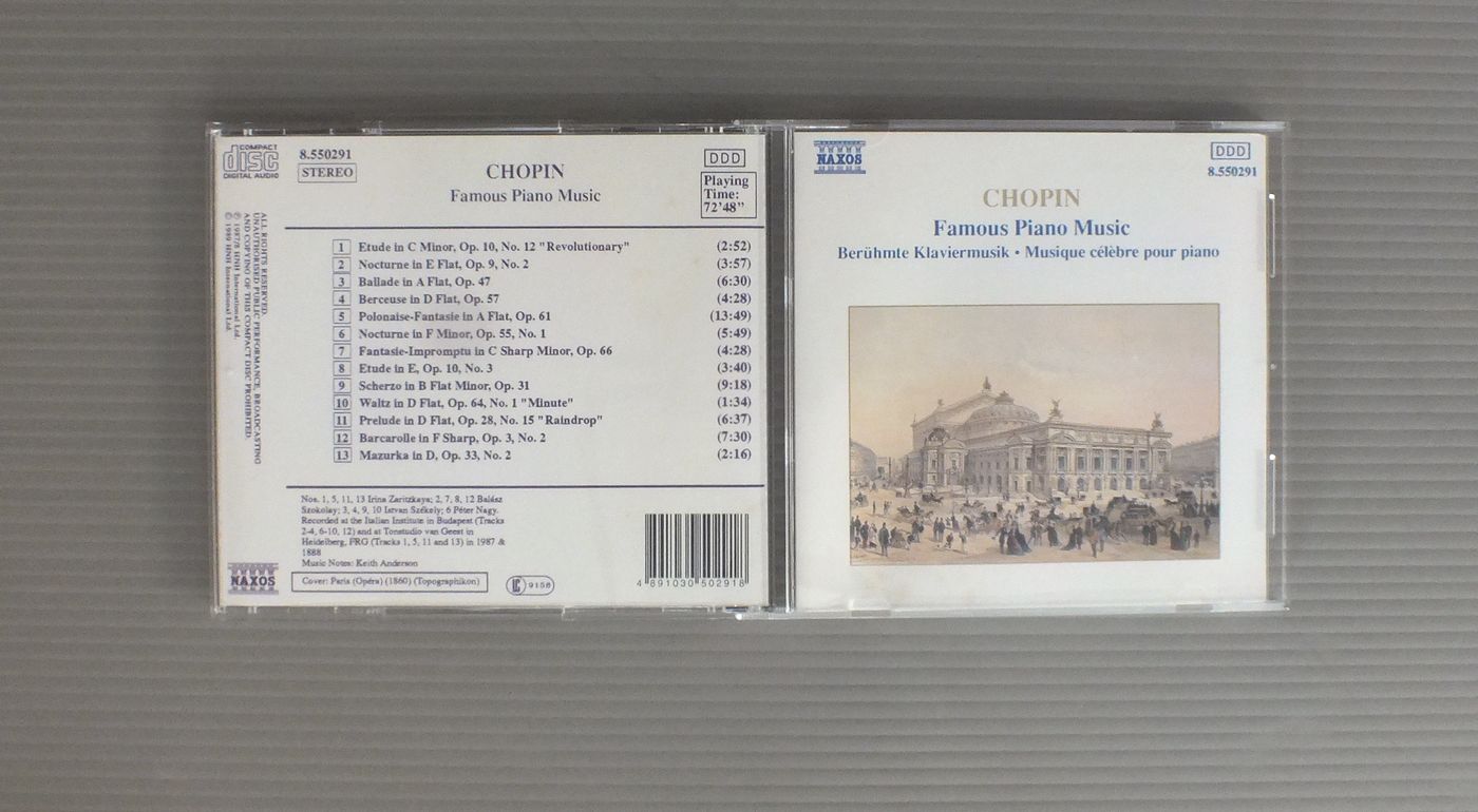 VARIOUS ARTISTS/CHOPIN FAMOUS PIANO MUSIC 8.550291 製造国:輸入盤 / Media:CD外観:EX-盤の状態:EX 価格(税込):¥440 送料 7inch:定形外郵便 360円~LP:定形外郵便 660円~送料は、注文の最終画面で確認頂けます。 > > VARIOUS ARTISTS/CHOPIN FAMOUS PIANO MUSIC 外観 (EX-)特記事項:表側のカードにシミやケースの爪跡有り。外観EX-の共通説明:ダメージ軽度~多少。 中古品としては普通の状態。シミ、ヨゴレ、スレなど軽く~多少。 盤の状態 (EX)特記事項:あまりスリキズはない感じ。盤EXの共通説明:盤面のスリキズが薄いものが少し~軽度 音に出そうなものは無いように見える(軽微なソフトティック音は除く)。 Tweet それぞれの画像をクリックすると、大きい写真が見られます こちらの商品もお勧めです 1,100円 ASHKENAZYアシュケナージ / CHOPIN - PIANO WORKSショパン - 夜想曲 990円 HOROVITZホロヴィッツ / BEETHOVEN - APPASSIONATA WALDSTEINベートーベン - ピアノ・ソナタ21番23番 990円 WEISSENBERGワイセンベルク / BACH - PARTITAS VOL.2バッハ - パルティータ第2番5番6番 990円 CZIFFRAシフラ / LISZT RECITALリスト リサイタル 990円 GARRICK OHLSSONギャリック・オールソン / CHOPIN - POLONAISESショパン - ポロネーズ 990円 ASHKENAZYアシュケナージ / BEETHOVEN - PIANO SONATA NO.1ベートーヴェン - ピアノソナタ第1番 1,540円 MAURIZIO POLLINIポリーニ / CHOPIN - POLONAISESショパン - ポロネーズ 1,760円 KAZUNE SHIMIZU清水和音 / CHOPIN - 4 BALLADESショパン - バラード