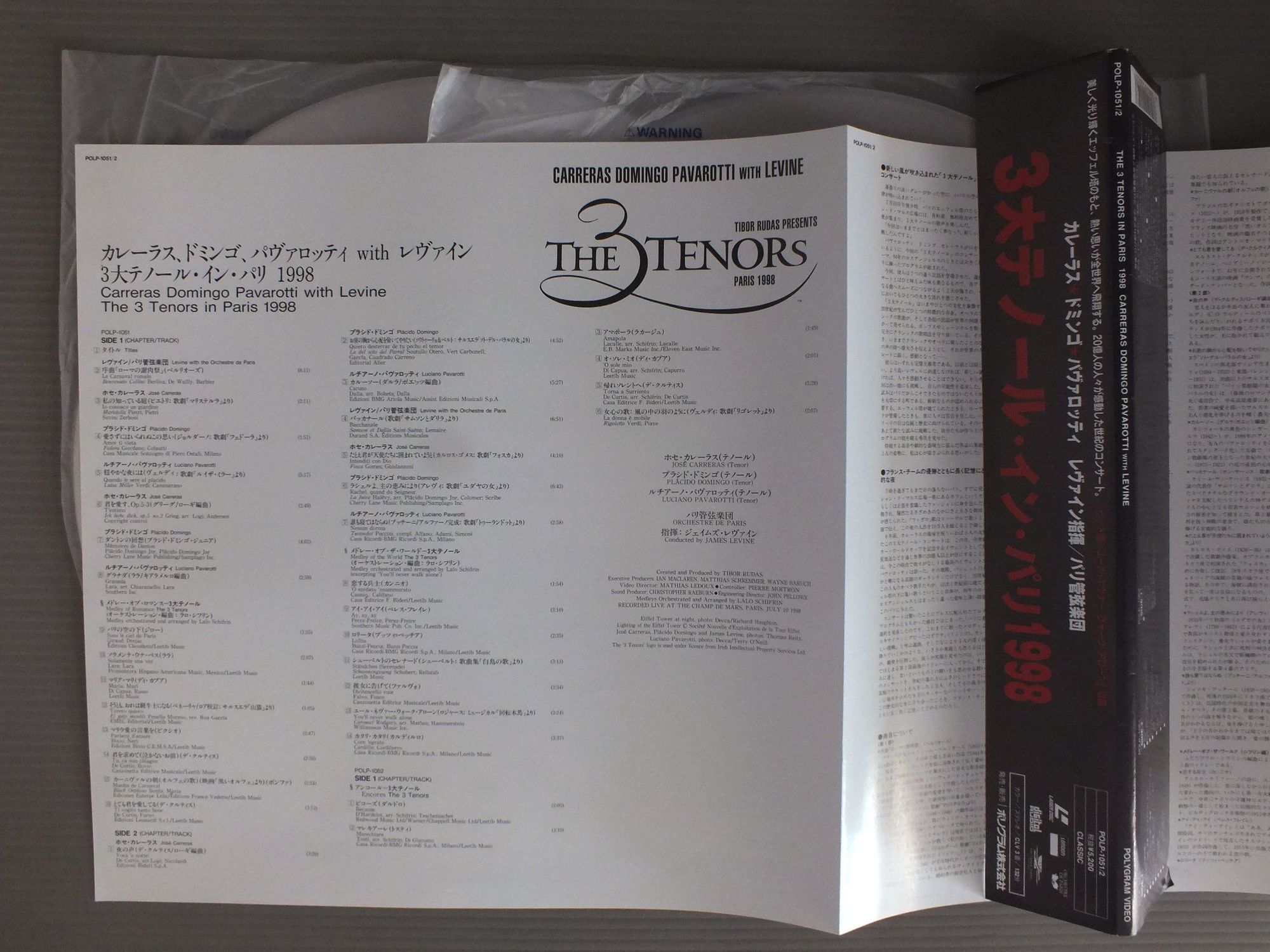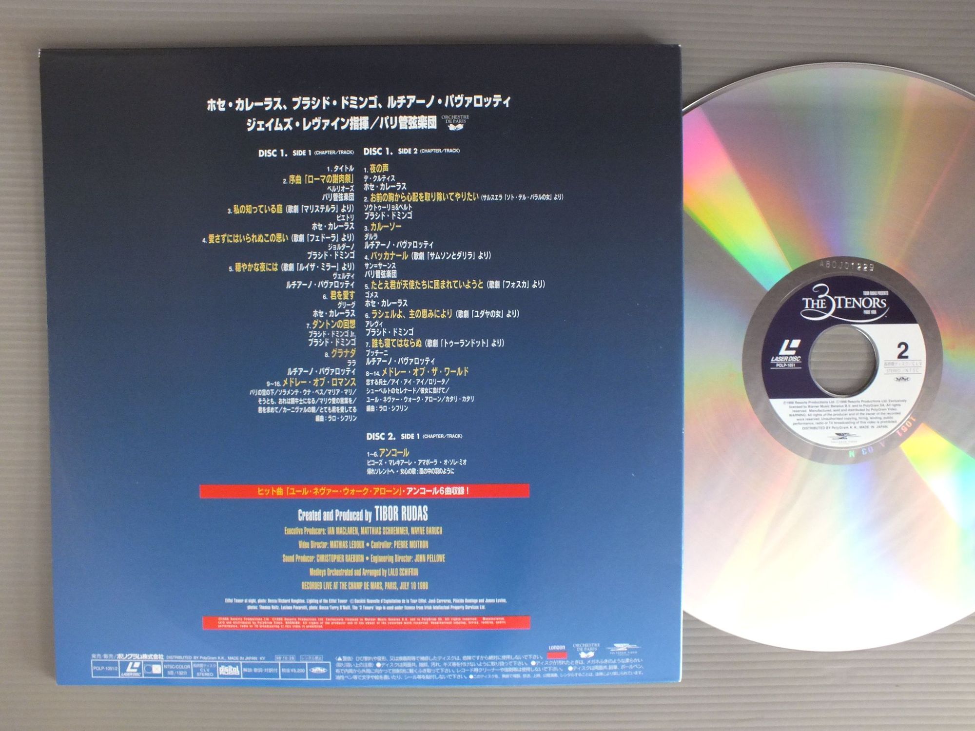 CARRERAS DOMINGO PAVAROTTI WITH LEVINEカレーラス - ドミンゴ - パヴァロッティ/3 TENORS IN PARIS 1998 2LD3大テノール・イン・パリ 1998 2枚組 POLP1051-2 製造国:日本盤 / Media:LD外観:EX盤の状態:EX+帯:EX+ 価格(税込):¥1,650 送料 7inch:定形外郵便 360円~LP:定形外郵便 660円~送料は、注文の最終画面で確認頂けます。 > > CARRERAS DOMINGO PAVAROTTI WITH LEVINE/3 TENORS IN PARIS 1998 2LD 外観 (EX)特記事項:よごれ等あまり無いきれいな状態です。ヨレ有り。外観EXの共通説明:ダメージが限定的。中古品としては保存状態がよい方。シミ、ヨゴレ、スレ 少し~軽度。 盤の状態 (EX+)特記事項:薄いスリキズ・スレ少し。一見してきれいな状態です。盤EX+の共通説明:盤面の極薄いスリキズ、スレ少し程度 音に出そうなものは無いように見える(極軽微なソフトティック音は除く)。 帯の状態 (EX+):よごれ等あまり無いきれいな状態です。 Tweet それぞれの画像をクリックすると、大きい写真が見られます こちらの商品もお勧めです 990円 JANET BAKER - BARBIROLLI - NEW PHILHARMONIA ORCHESTRAジャネット・ベイカー - バルビローリ - ニュウ・フィルハーモニア / RAVEL - SHEHERAZADEラヴェル - シェヘラザード 1,320円 SCHWARZKOPF - LUDWIG - SYMPHONY ORCH. OF RADIO BERLINシュワルツコフ - ベルリン放送交響楽団 / WEBER - ABU HASSANウェーバー歌劇アブ・ハッサン 990円 YELENA OBRAZTSOVA - KHAIKIN - BOLISHOI THEATRE ORCH.エレーナ・オブラスツォワ - ハイキン - ボリショイ歌劇場管弦楽団 / OPERA ARIASオペラ・アリア集 2,420円 LILY PONSリリー・ポンス / LILY PONS GALA 990円 MARIA CALLASマリア・カラス / BIZET - CARMEN HIGHLIGHTSビゼー - 歌劇カルメン ハイライト 1,540円 DOMINGO ドミンゴ / VERDI ARIASヴィルディ オペラアリア集 1,540円 HERMANN PREY - BERNHARD KLEEヘルマン・プレイ&ベルナルト・クレー / MOZART - LIEDERモーツアルト歌曲集 1,540円 HELENE MANE (SOPRANO) & ZUZANA RUZICKOVA(HARPSICHORD)ヘレン・マネ(ソプラノ)&ズザナ・ルージチコヴァー(チェンバロ) / BACH - HANDEL etc