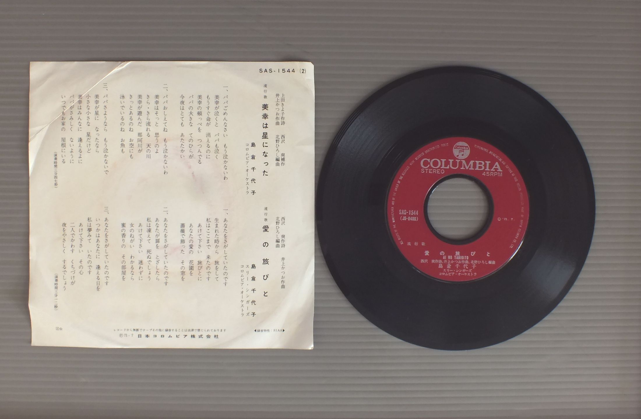 CHIYOKO SHIMAKURA島倉千代子/MIYUKI-HA HOSHI-NI NATTA美幸は星になった Y400 製造国:日本盤 / Media:7inch外観:EX-盤の状態:EX 価格(税込):¥550 送料 7inch:定形外郵便 360円~LP:定形外郵便 660円~送料は、注文の最終画面で確認頂けます。 > > CHIYOKO SHIMAKURA/MIYUKI-HA HOSHI-NI NATTA 外観 (EX-)特記事項:ジャケ表面にシミやよごれ少し有り。ヨレ有り。折れ有り。外観EX-の共通説明:ダメージ軽度~多少。 中古品としては普通の状態。シミ、ヨゴレ、スレなど軽く~多少。 盤の状態 (EX)特記事項:多少薄いスリキズ・スレ軽くある感じ。殆どが軽微なものの様子です。盤EXの共通説明:盤面のスリキズが薄いものが少し~軽度 音に出そうなものは無いように見える(軽微なソフトティック音は除く)。 Tweet それぞれの画像をクリックすると、大きい写真が見られます こちらの商品もお勧めです 660円 KOJO TSURUTA鶴田浩二 / RED AND BLACK BLUES赤と黒のブルース 660円 AKIRA MATSUDAIRA松平晃 / CIRCUS SONG懐かしの針音 松平晃 サーカスの唄 1,210円 高峰秀子-橋幸夫 他 / 続 日本流行歌史 660円 CHIEKO SATOH佐藤千夜子 / BEST COLLECTIONオリジナル原盤による懐しの歌声シリーズ4 東京行進曲 770円 三浦洸一 / ゴールデン・ヒット 880円 YUKIO HASHI橋幸夫 / FROM ITAKOGASA TO MUHYO黄金の声/潮来笠から霧氷まで 550円 HISAO ITO伊藤久男 / BEST ALBUM懐しの歌声 伊藤久男と共に 880円 上原敏 / ポリドール(SP原盤)シリーズ -第6集- 哀愁の抒情・マドロス歌謡