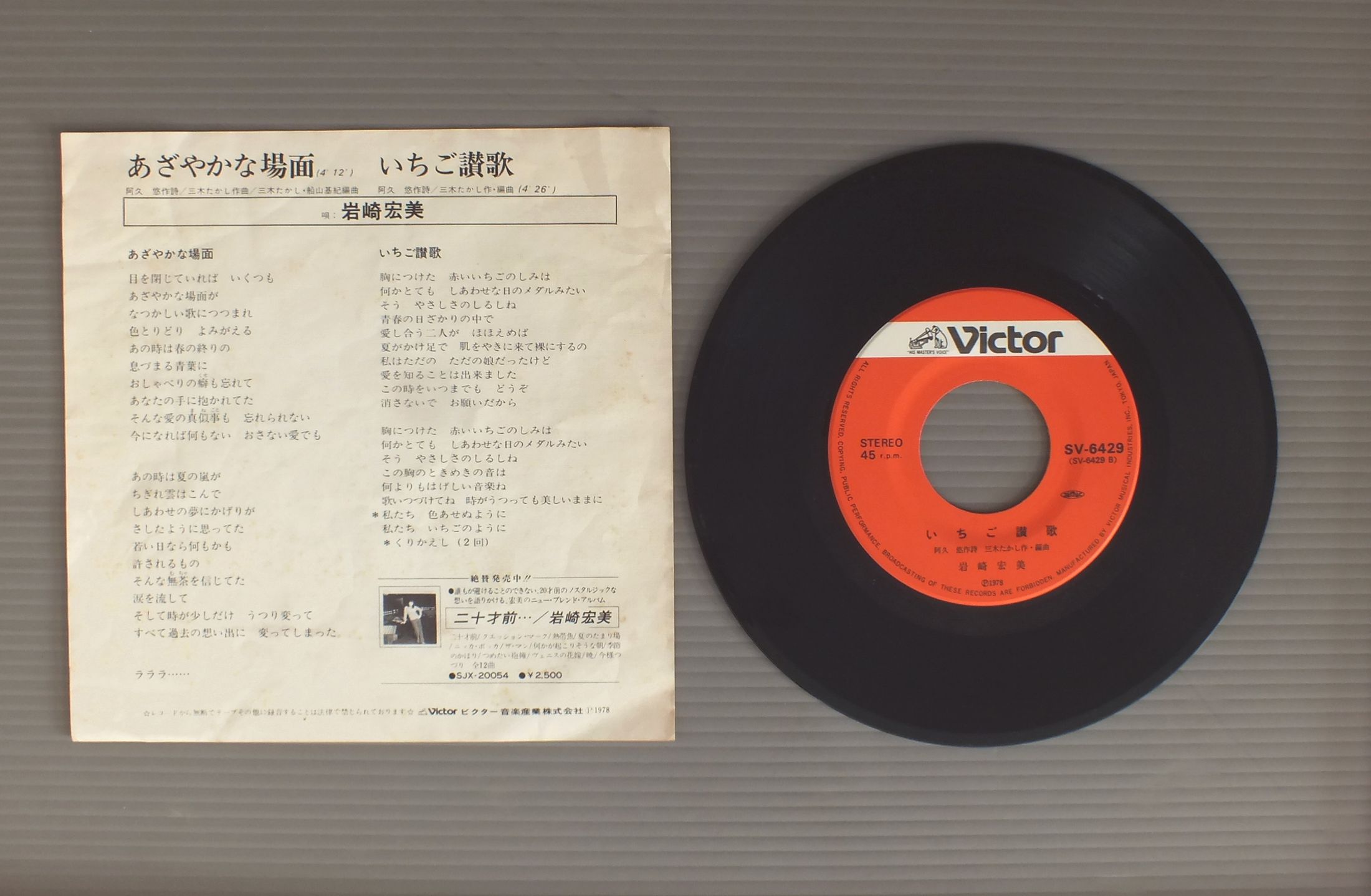 HIROMI IWASAKI岩崎宏美/AZAYAKANA BAMENあざやかな場面 SV6429 製造国:日本盤 / Media:7inch外観:VG+盤の状態:EX 価格(税込):¥330 送料 7inch:定形外郵便 360円~LP:定形外郵便 660円~送料は、注文の最終画面で確認頂けます。 > > HIROMI IWASAKI/AZAYAKANA BAMEN 外観 (VG+)特記事項:ジャケ表面にシミやよごれ多少有り。ヨレ有り。外観VG+の共通説明:ダメージやや有り。シミ、ヨゴレ、スレなど多少~やや多め。 盤の状態 (EX)特記事項:多少薄いスリキズ・スレ軽くある感じ。殆どが軽微なものの様子です。盤EXの共通説明:盤面のスリキズが薄いものが少し~軽度 音に出そうなものは無いように見える(軽微なソフトティック音は除く)。 Tweet それぞれの画像をクリックすると、大きい写真が見られます こちらの商品もお勧めです 1,210円 YUKO TOMITAとみたゆう子 / CLASSICAL HEARTクラシカル・ハート 1,320円 PINK LADYピンク・レディー / PINK LADY-SUMMER FIRE `77ピンク・レディー-サマー・ファイア `77 1,210円 SONOKO KAWAI河合その子 / SIESTAシエスタ 990円 SONOKO KAWAI河合その子 / SIESTAシエスタ 660円 YUKO ISHIKAWA石川優子 / SENTIMENTAL ROADセンチメンタル・ロード 1,210円 NAOKO KAWAI河合奈保子 / DIARYダイアリー 770円 ERI NITTA新田恵利 / ERI 1,210円 PINK LADYピンク・レディー / PINK LADY CHALLENGE CONCERTピンク・レディー・チャレンジ・コンサート
