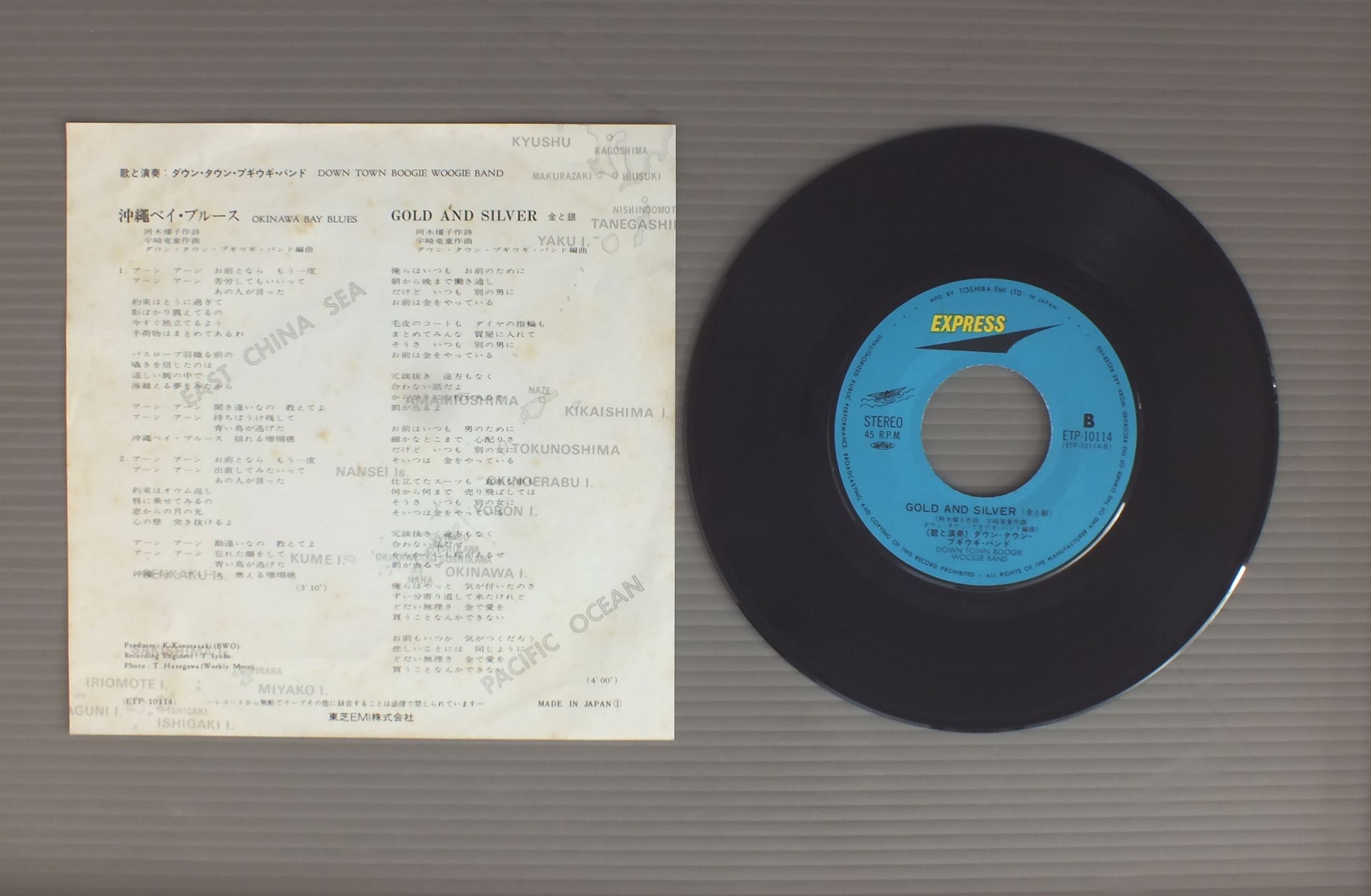 DOWN TOWN BOOGIE-WOOGIE BANDダウンタウン・ブギウギ・バンド/OKINAWA BAY BLUES沖縄ベイ・ブルース ETP10114 製造国:日本盤 / Media:7inch外観:EX-盤の状態:EX 価格(税込):¥330 送料 7inch:定形外郵便 360円~LP:定形外郵便 660円~送料は、注文の最終画面で確認頂けます。 > > DOWN TOWN BOOGIE-WOOGIE BAND/OKINAWA BAY BLUES 外観 (EX-)特記事項:裏ジャケにシミ有り。ヨレ有り。外観EX-の共通説明:ダメージ軽度~多少。 中古品としては普通の状態。シミ、ヨゴレ、スレなど軽く~多少。 盤の状態 (EX)特記事項:多少薄いスリキズ・スレ軽くある感じ。殆どが軽微なものの様子です。盤EXの共通説明:盤面のスリキズが薄いものが少し~軽度 音に出そうなものは無いように見える(軽微なソフトティック音は除く)。 Tweet それぞれの画像をクリックすると、大きい写真が見られます こちらの商品もお勧めです 990円 YUKO TOMITAとみたゆう子 / DEUXDEUX (2nd ALBUM) 770円 KENJI SAWADA沢田研二 / OMOIKKIRI KIZANA JINSEI思いきり気障な人生 770円 TULIPチューリップ / BOKU GATSUKUTTA AINO UTAぼくがつくった愛のうた 880円 TAKURO YOSHIDA吉田拓郎 / ROLLING 30 + FREE 7inchローリング30+おまけ7インチ 770円 CHAGE & ASUKAチャゲ&飛鳥 / 4th ALBUN 21 CENTURY21世紀 770円 CHIKA UEDA上田知華 / MISS HEARTミス・ハート 660円 TULIPチューリップ / MUGEN KIDO無限軌道 1,210円 EIKICHI YAZAWA矢沢永吉 / RISING SUNライジング・サン