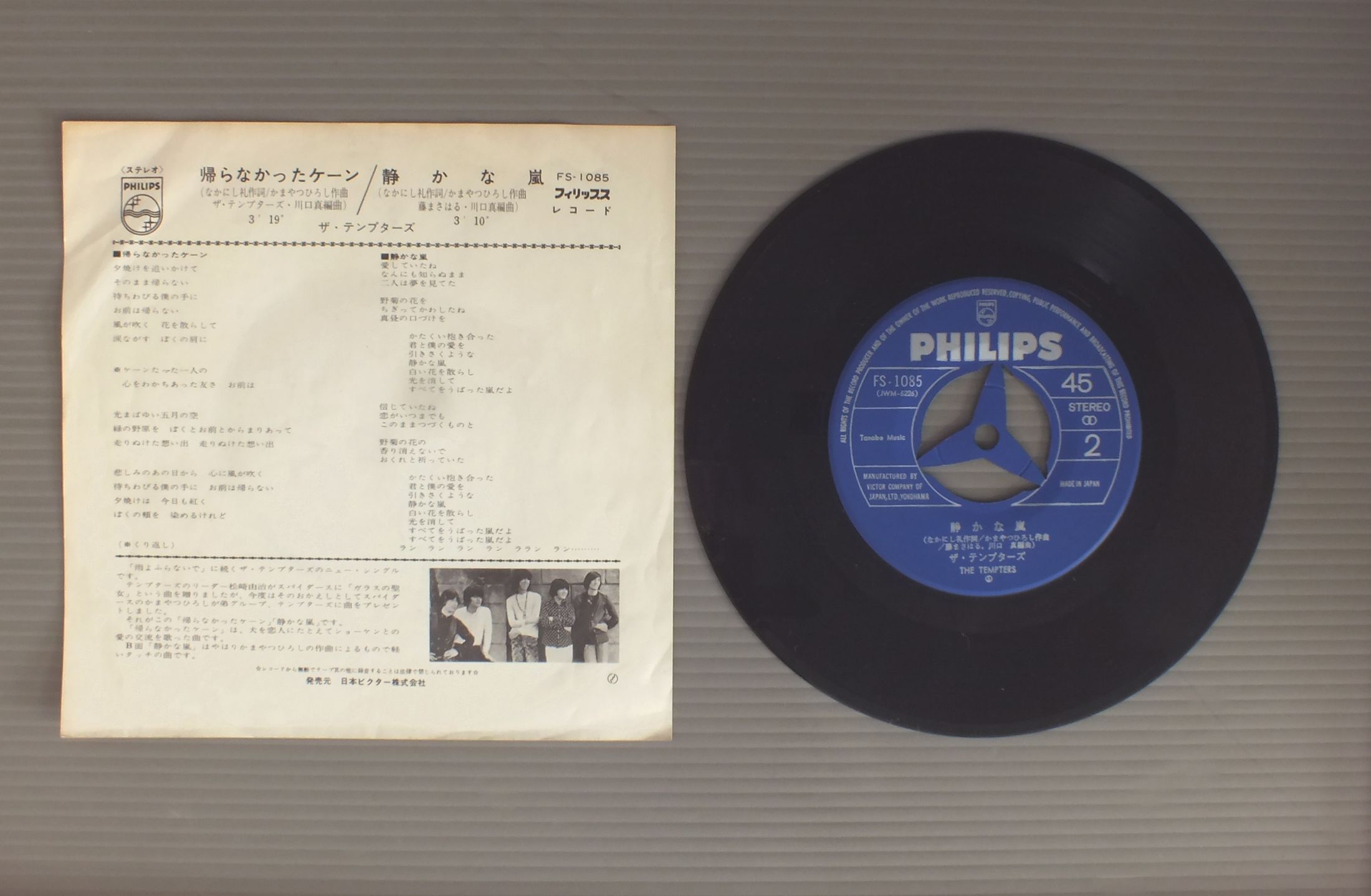 TEMPTERSテンプターズ/SHIZUKANA ARASHI静かな嵐 FS1085 製造国:日本盤 / Media:7inch外観:EX盤の状態:EX- 価格(税込):¥770 送料 7inch:定形外郵便 360円~LP:定形外郵便 660円~送料は、注文の最終画面で確認頂けます。 > > TEMPTERS/SHIZUKANA ARASHI 外観 (EX)特記事項:ジャケ表面にシミやよごれ少し有り。ヨレ有り。外観EXの共通説明:ダメージが限定的。中古品としては保存状態がよい方。シミ、ヨゴレ、スレ 少し~軽度。 盤の状態 (EX-)特記事項:薄いスリキズ・細かい表面スレ多少ある感じ。全体的には殆どが軽微なものの様子です。盤EX-の共通説明:盤面のスリキズが多少有り。音に出そうなものは殆ど無いように見える~さほど気にならないぐらいの軽いプチ数カ所程度。 Tweet それぞれの画像をクリックすると、大きい写真が見られます こちらの商品もお勧めです 1,210円 TIGERSタイガース / TIGERS 1982十年ロマンス 770円 TIGERSタイガース / HUMAN RENASCENCEヒューマン・ルネッサンス 660円 YUZO KAYAMA加山雄三 / 15TH ANNIVERSARY加山雄三1976 武道館ライブ 3,850円 OXオックス / FIRST ALBUMファースト・アルバム 550円 TIGERSタイガース / 10 YEARS ROMANCE十年ロマンス 2,420円 OXオックス / TELL ME-OX ON STAGE No1テルミー-オックス・オン・ステージ No1 1,650円 MUNETAKA INOUE & HIS SHARP FIVE井上宗孝とシャープ・ファイヴ / SHARP FIVE SCREEN GO GOシャープ・ファイヴ・スクリーン・ゴーゴー 770円 TIGERSタイガース / TIGERS 1982タイガース 1982