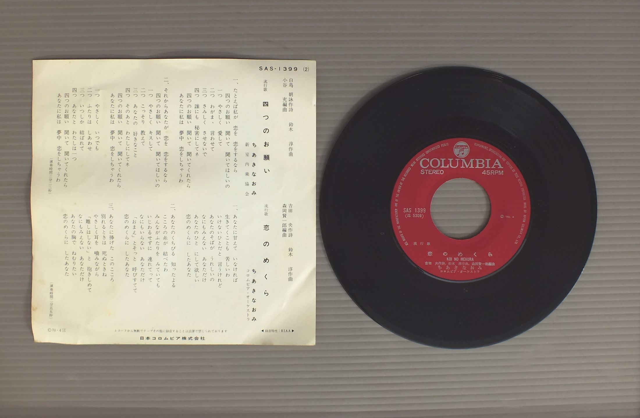NAOMI CHIAKIちあきなおみ/YOTTSU NO ONEGAI四つのお願い SAS1399 製造国:日本盤 / Media:7inch外観:EX-盤の状態:EX- 価格(税込):¥330 送料 7inch:定形外郵便 360円~LP:定形外郵便 660円~送料は、注文の最終画面で確認頂けます。 > > NAOMI CHIAKI/YOTTSU NO ONEGAI 外観 (EX-)特記事項:ジャケ表面にシミやよごれ多少有り。ヨレ有り。外観EX-の共通説明:ダメージ軽度~多少。 中古品としては普通の状態。シミ、ヨゴレ、スレなど軽く~多少。 盤の状態 (EX-)特記事項:薄いスリキズ・細かい表面スレ多少ある感じ。全体的には殆どが軽微なものの様子です。盤EX-の共通説明:盤面のスリキズが多少有り。音に出そうなものは殆ど無いように見える~さほど気にならないぐらいの軽いプチ数カ所程度。 Tweet それぞれの画像をクリックすると、大きい写真が見られます こちらの商品もお勧めです 990円 TADUMI TOYOSHIUMA豊島たづみ / STILL NIGHT 990円 TAOタオ / FAR EAST 770円 CHAGE & ASUKAチャゲ&飛鳥 / 4th ALBUN 21 CENTURY21世紀 1,650円 MOMOE YAMAGUCHI山口百恵 / MOBIUS`S GAMEメビウス・ゲーム 990円 CAROLキャロル / 1975 4.13.1975 4.13. 1,210円 AKIRA KOBAYASHI小林旭 / マイトガイ・ゴールデン・ヒット 990円 MASAMICHI SUGI杉真理 / STARGAZERスターゲイザー 550円 MASAHIRO KUWANA & TEAR DROPS桑名正博 & TEAR FROPS / COMMUNICATIONコミュニケーション