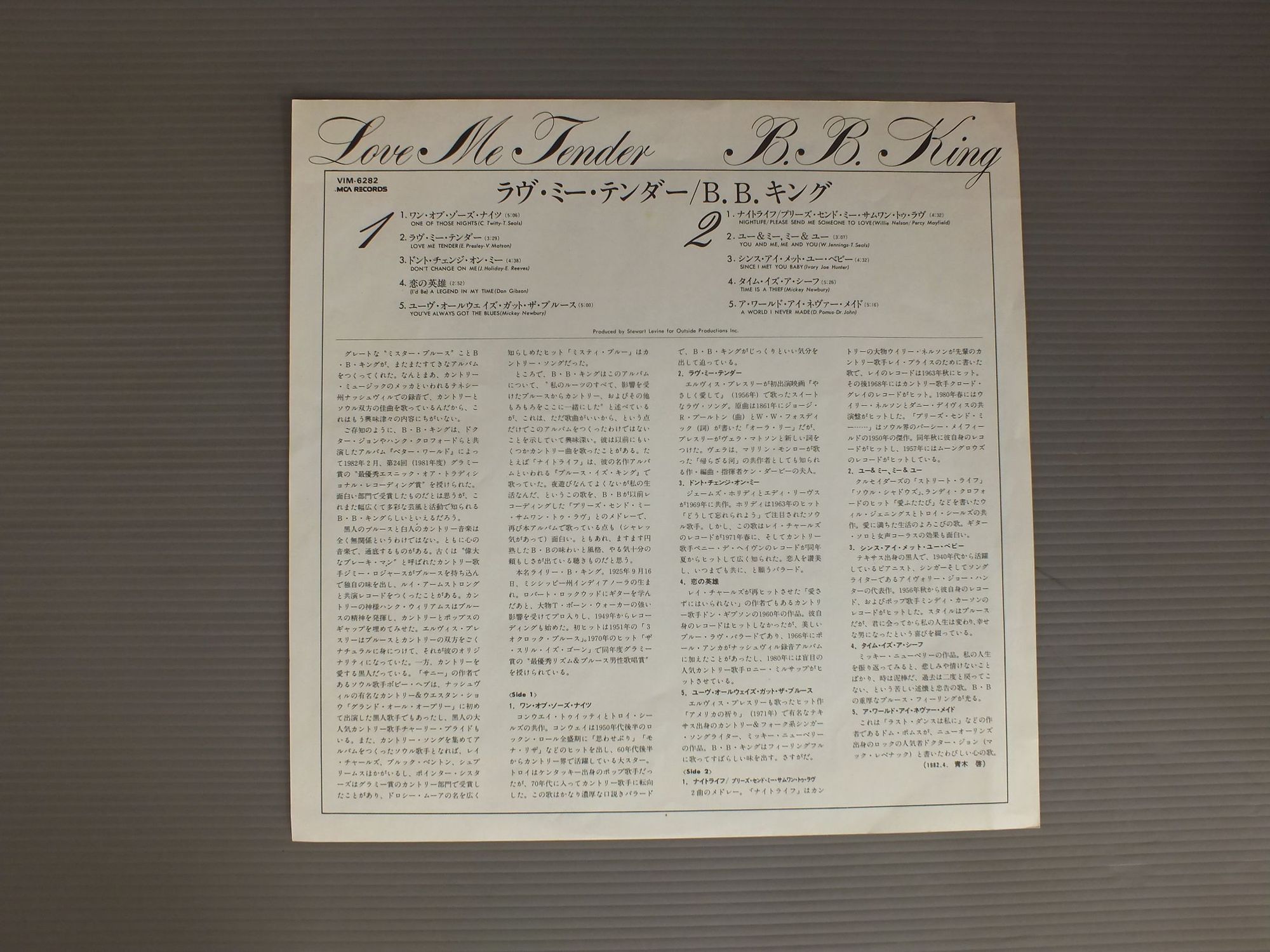 B.B.KINGB.B キング/LOVE ME TENDERラブ・ミ・テンダー VIM6282 製造国:日本盤 / Media:LP外観:EX盤の状態:EX 価格(税込):¥1,210 送料 7inch:定形外郵便 360円~LP:定形外郵便 660円~送料は、注文の最終画面で確認頂けます。 レコード検索 > SWING/BIG BAND > B.B.KING/LOVE ME TENDER 外観 (EX)特記事項:よごれ、スレ等少ないきれいな状態です。外観EXの共通説明:ダメージが限定的。中古品としては保存状態がよい方。シミ、ヨゴレ、スレ 少し~軽度。 盤の状態 (EX)特記事項:薄いスリキズ・スレ軽くある感じ。軽微なものが中心です。盤EXの共通説明:盤面のスリキズが薄いものが少し~軽度 音に出そうなものは無いように見える(軽微なソフトティック音は除く)。 Tweet それぞれの画像をクリックすると、大きい写真が見られます こちらの商品もお勧めです 1,980円 BUTTERFIELD BLUES BANDバターフィールド・ブルース・バンド / KEEP ON MOVINGキープ・オン・ムービング 440円 Z.Z.HILLZ.Z.ヒル / Z.Z.HILLZ.Z.ヒル