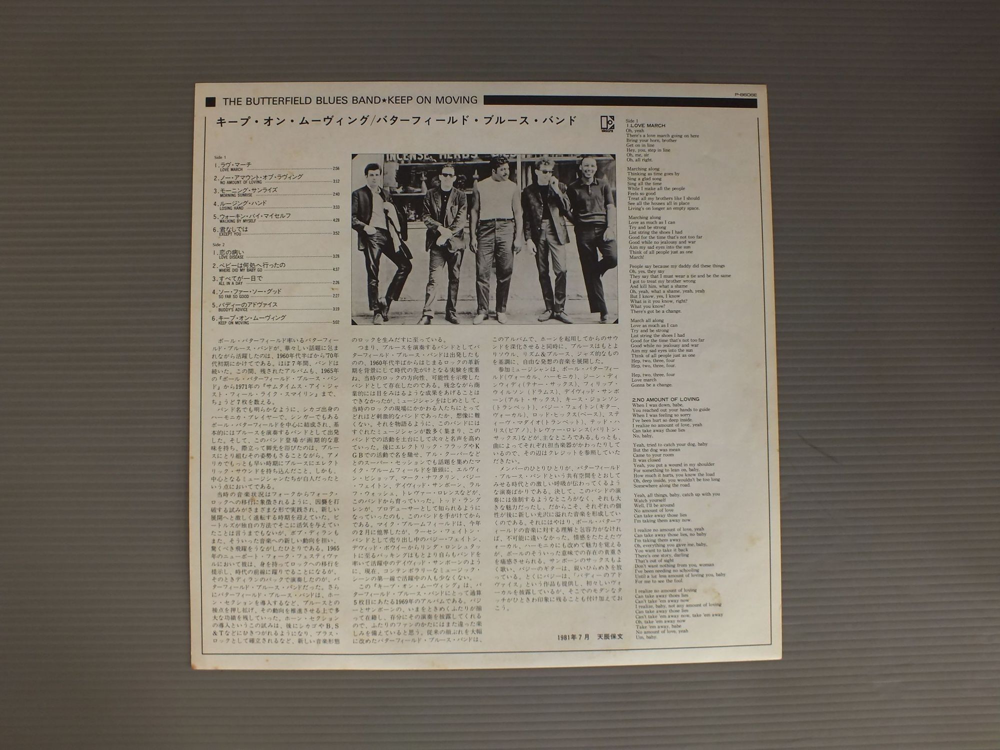 BUTTERFIELD BLUES BANDバターフィールド・ブルース・バンド/KEEP ON MOVINGキープ・オン・ムービング KKS74053 製造国:日本盤 / Media:LP外観:EX-盤の状態:EX 価格(税込):¥1,980 送料 7inch:定形外郵便 360円~LP:定形外郵便 660円~送料は、注文の最終画面で確認頂けます。 > > BUTTERFIELD BLUES BAND/KEEP ON MOVING 外観 (EX-)特記事項:ジャケ表面にシミやよごれ多少有り。外観EX-の共通説明:ダメージ軽度~多少。 中古品としては普通の状態。シミ、ヨゴレ、スレなど軽く~多少。 盤の状態 (EX)特記事項:多少薄いスリキズ・スレ軽くある感じ。殆どが軽微なものの様子です。盤EXの共通説明:盤面のスリキズが薄いものが少し~軽度 音に出そうなものは無いように見える(軽微なソフトティック音は除く)。 Tweet それぞれの画像をクリックすると、大きい写真が見られます こちらの商品もお勧めです 440円 Z.Z.HILLZ.Z.ヒル / Z.Z.HILLZ.Z.ヒル 1,210円 B.B.KINGB.B キング / LOVE ME TENDERラブ・ミ・テンダー