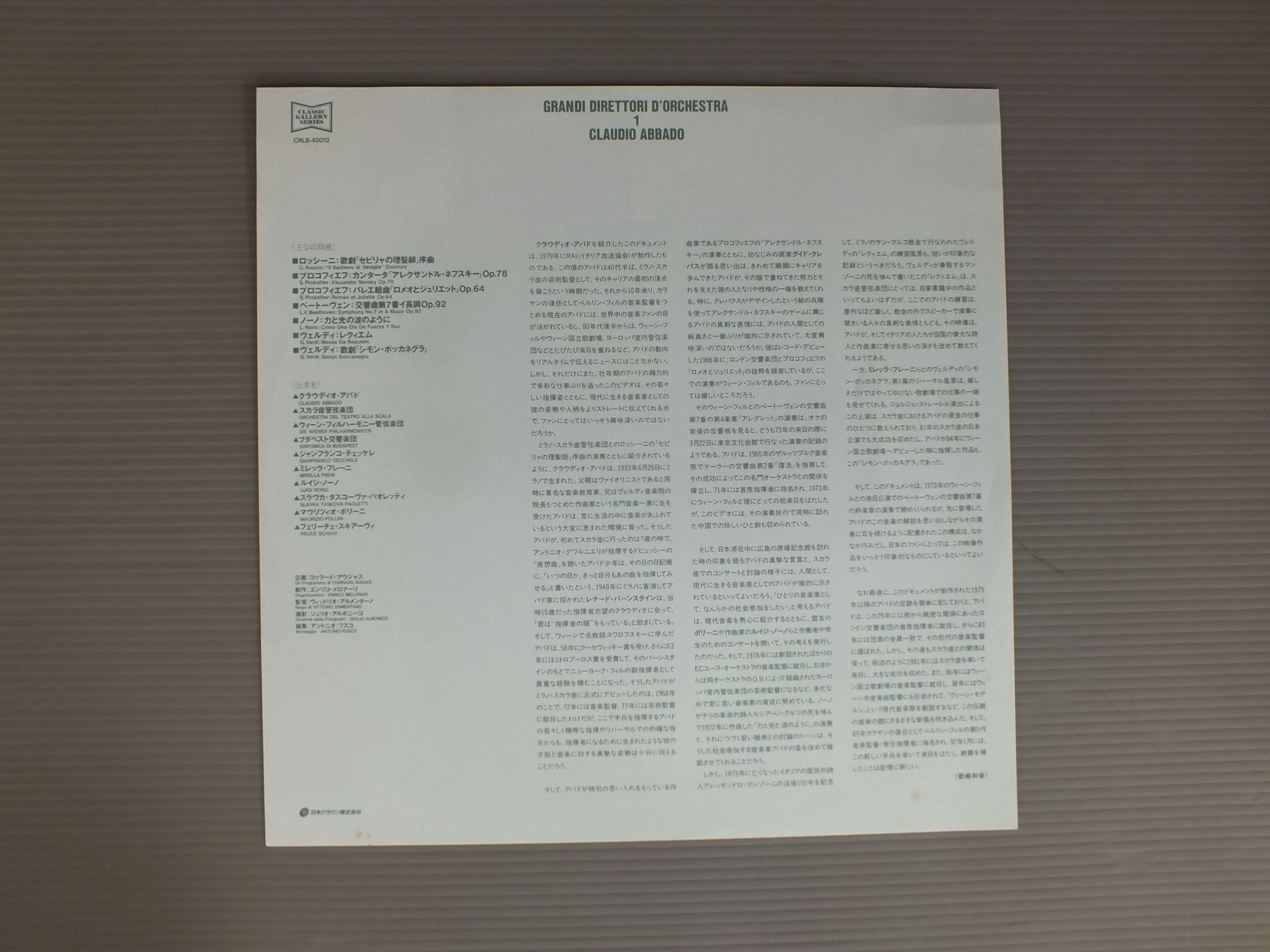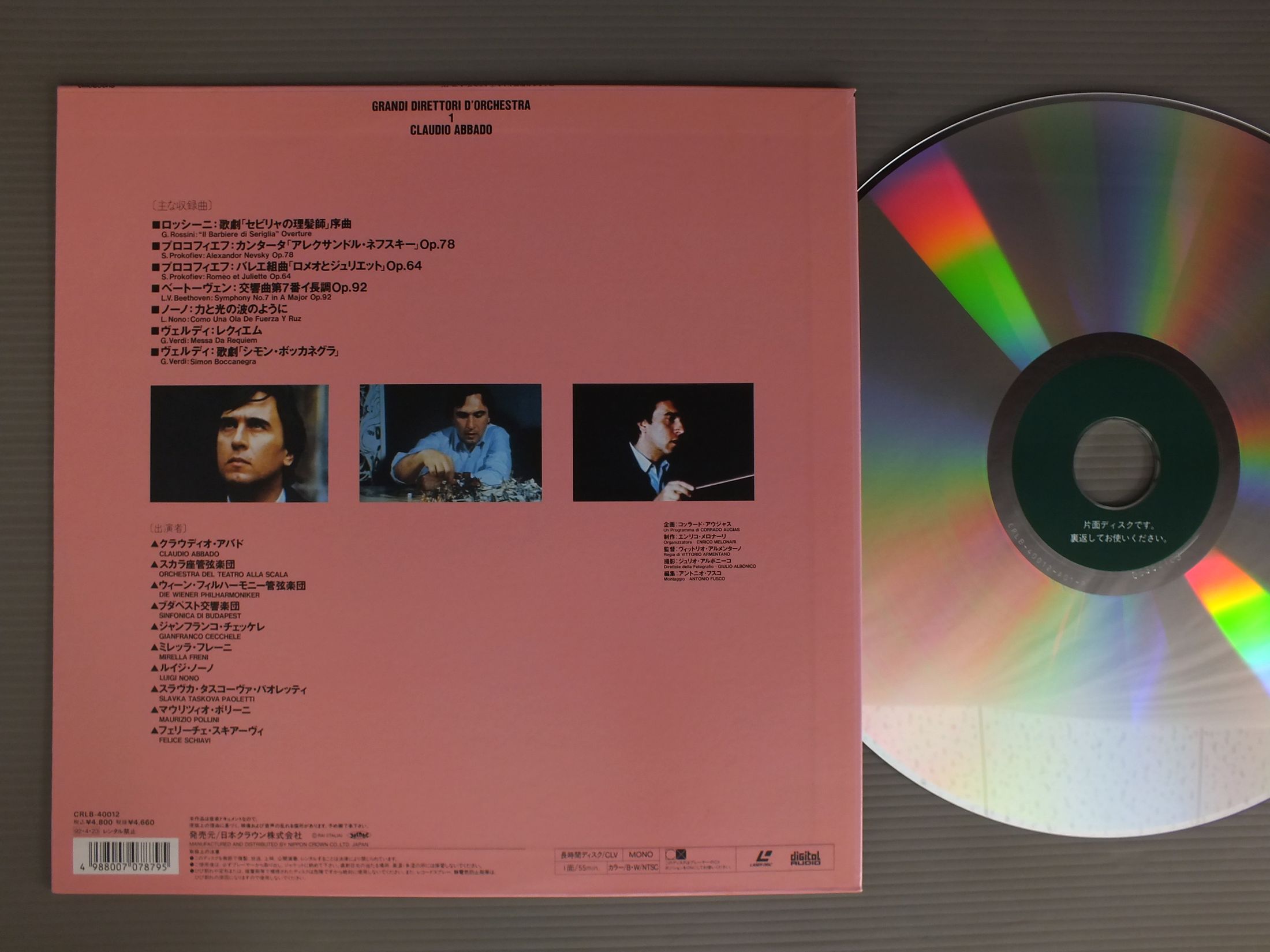 ABBADOアバド/GRANDI DIRETTORI D`ORCH. 1イタリア放送協会制作ドキュメンタリー映画 CRLB40012 製造国:日本盤 / Media:LD外観:EX+盤の状態:EX 価格(税込):¥1,155 送料 7inch:定形外郵便 360円~LP:定形外郵便 660円~送料は、注文の最終画面で確認頂けます。 > > ABBADO/GRANDI DIRETTORI D`ORCH. 1 外観 (EX+)特記事項:よごれ等あまり無いきれいな状態です。外観EX+の共通説明:中古としては美品、一見してきれいでダメージが軽微。シミ、ヨゴレ、スレ有っても僅か~少し。 盤の状態 (EX)特記事項:薄いスリキズ・スレ少しある感じ。盤EXの共通説明:盤面のスリキズが薄いものが少し~軽度 音に出そうなものは無いように見える(軽微なソフトティック音は除く)。 Tweet それぞれの画像をクリックすると、大きい写真が見られます こちらの商品もお勧めです 990円 STERN - ORMANDY - THE PHILADERPHIA ORCH.スターン - オーマンディ - フィラデルフィア管弦楽団 / BRAHMS - VIOLIN CONCERTOブラームス - ヴァイオリン協奏曲 990円 BRENDEL - MARRTNER - ACADEMY OF ST.MARTIN IN THE FIELDSブレンデル - マリナー - アカデミー室内管弦楽団 / MOZRT - PIANO CONCERTOS NO19 NO23モーツァルト - ピアノ協奏曲第19番23番 990円 KENPE - BERLIN PHILHARMONIC ORCHESTRAケンペ - ベルリン・フィルハーモニー管弦楽団 / DVORAK - SYMPHONY NO.9ドヴォルザーク - 交響曲第9番 新世界より 1,540円 BOHM - BERLINER PHILHARMONIKERベーム - ベルリン・フィル / MOZART - SINFONIE CONCERTANTI KV364&297モーツアルト協奏交響曲KV364&297 990円 DURUFLE - PRETRE - LA SOCIETE DES CONCERTS DU CONSERVATOIREデュリュフレ - プレートル - パリ音楽院管弦楽団 / SAINT SAENS - SYMPHONY NO.3サン・サーンス - 交響曲第3番 1,100円 BOULT他 / MAHLER 9 SYMPHONIES 12 LP BOX 990円 KARAJAN - BERLINER PHILHARMONIKERカラヤン - ベルリン・フィル / MOZART - EINE KLEINE NACHTMUSIKモーツアルト - アイネ・クライネ・ナハトムジーク 990円 TALICH - CZECH PHILHARMONIC ORCH.ターリッヒ - チェコ・フィルハーモニー管弦楽団 / DVORAK - STABAT MATERドヴォルザーク - スターバト・マーテル