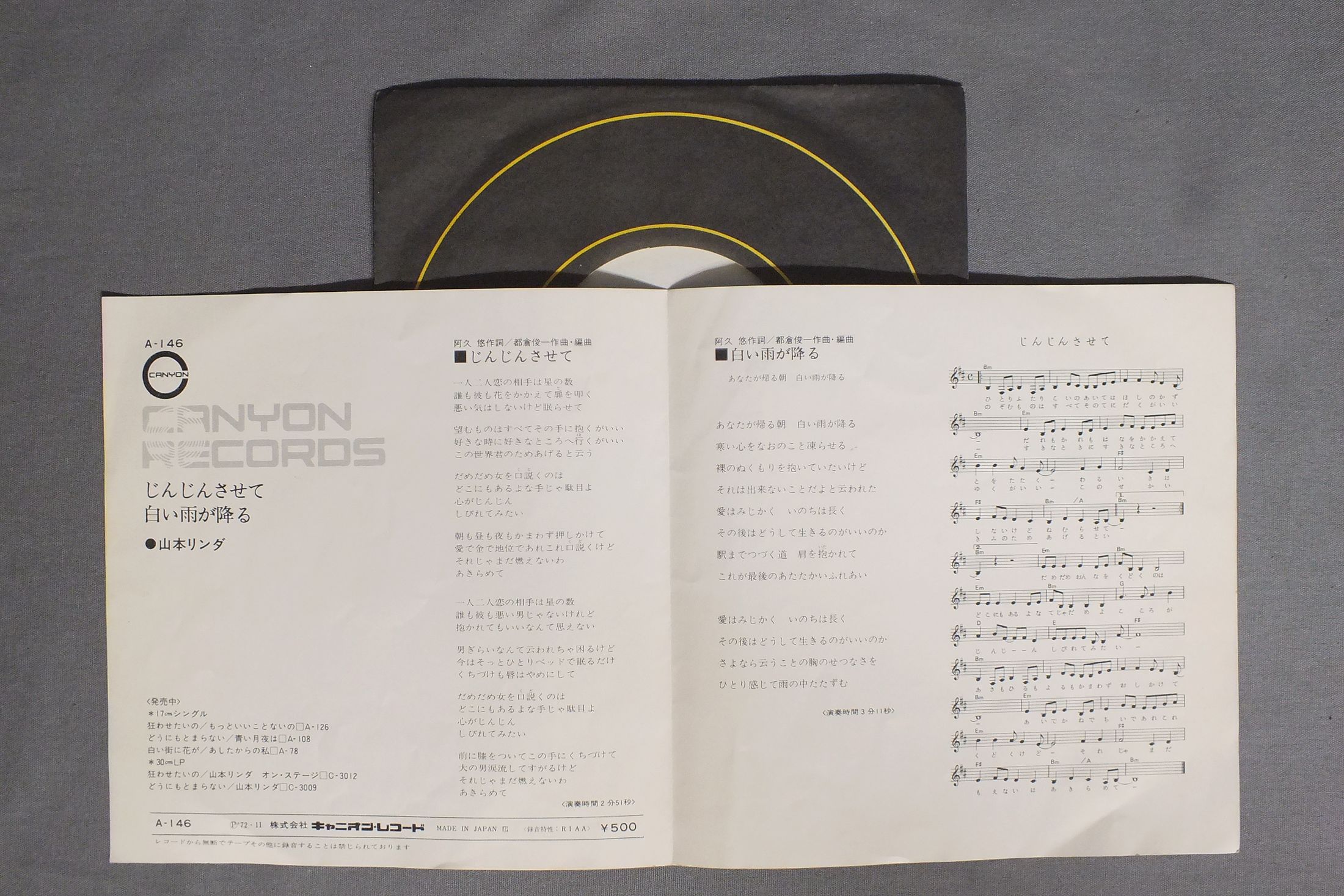 YAMAMOTO LINDA山本リンダ/JINJIN SASETEじんじんさせて A-146 製造国:日本盤 / Media:7inch外観:EX-盤の状態:EX 価格(税込):¥770 送料 7inch:定形外郵便 360円~LP:定形外郵便 660円~送料は、注文の最終画面で確認頂けます。 > > YAMAMOTO LINDA/JINJIN SASETE 外観 (EX-)特記事項:ジャケ表面にシミやよごれ少し。ヨレシワ少し有り。外観EX-の共通説明:ダメージ軽度~多少。 中古品としては普通の状態。シミ、ヨゴレ、スレなど軽く~多少。 盤の状態 (EX)特記事項:薄いスリキズ・スレ軽くある感じ。軽微なものが中心です。盤EXの共通説明:盤面のスリキズが薄いものが少し~軽度 音に出そうなものは無いように見える(軽微なソフトティック音は除く)。 Tweet それぞれの画像をクリックすると、大きい写真が見られます こちらの商品もお勧めです 990円 CANDIESキャンディーズ / THE BEST