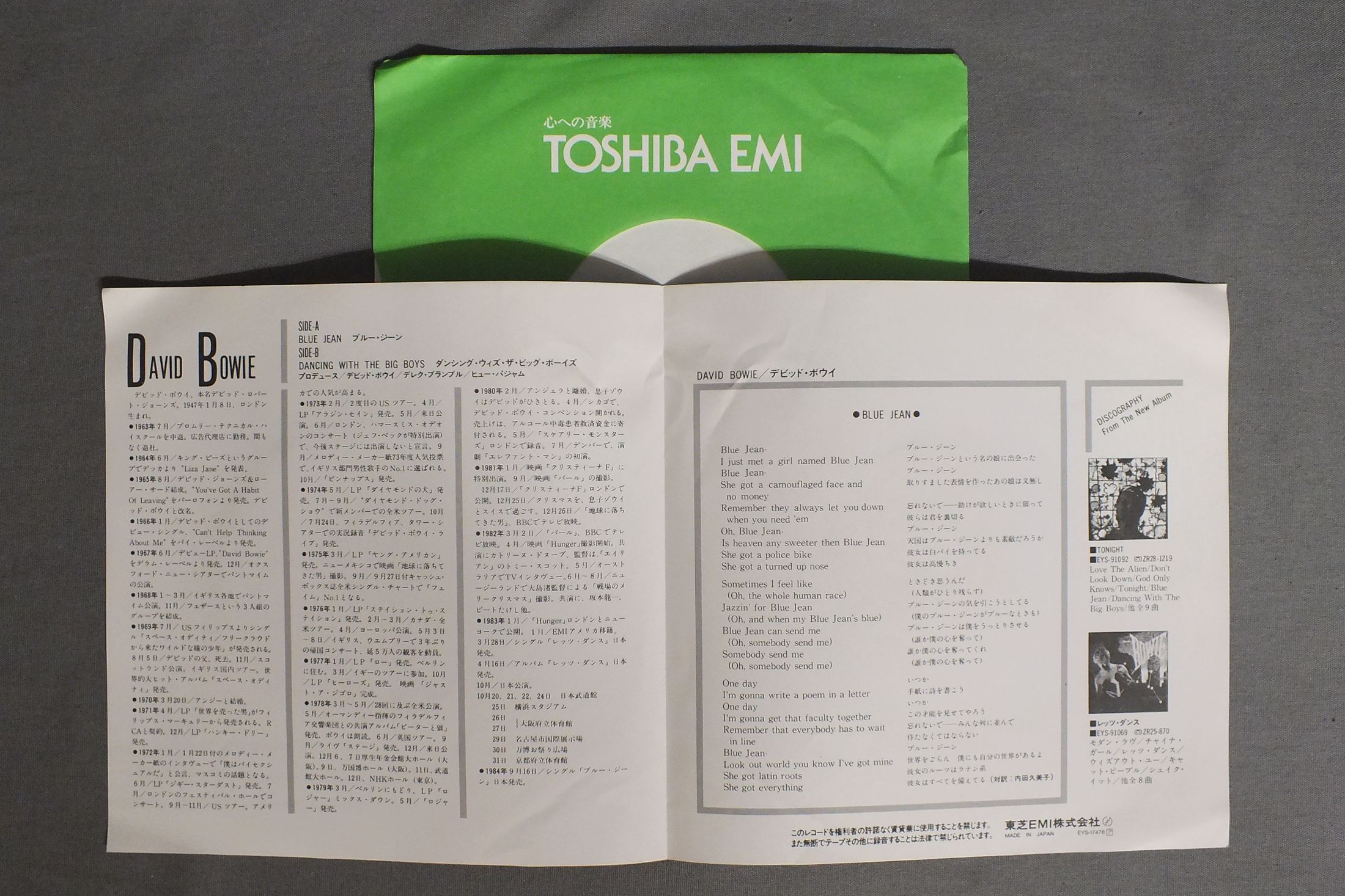 DAVID BOWIEデヴィッド・ボウイ/BLUE JEAN ブルー・ジーン EYS-17476 製造国:日本盤 / Media:7inch外観:EX盤の状態:EX 価格(税込):¥880 送料 7inch:定形外郵便 360円~LP:定形外郵便 660円~送料は、注文の最終画面で確認頂けます。 > > DAVID BOWIE/BLUE JEAN 外観 (EX)特記事項:ジャケ表面にシミやよごれ少し。ヨレシワ少し有り。ジャケットにヨレあり。外観EXの共通説明:ダメージが限定的。中古品としては保存状態がよい方。シミ、ヨゴレ、スレ 少し~軽度。 盤の状態 (EX)特記事項:薄いスリキズ・スレ軽くある感じ。軽微なものが中心です。盤EXの共通説明:盤面のスリキズが薄いものが少し~軽度 音に出そうなものは無いように見える(軽微なソフトティック音は除く)。 Tweet それぞれの画像をクリックすると、大きい写真が見られます こちらの商品もお勧めです