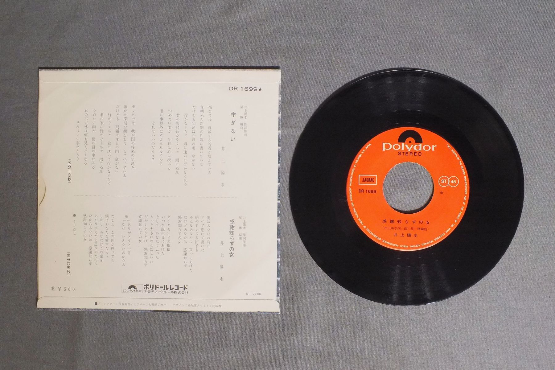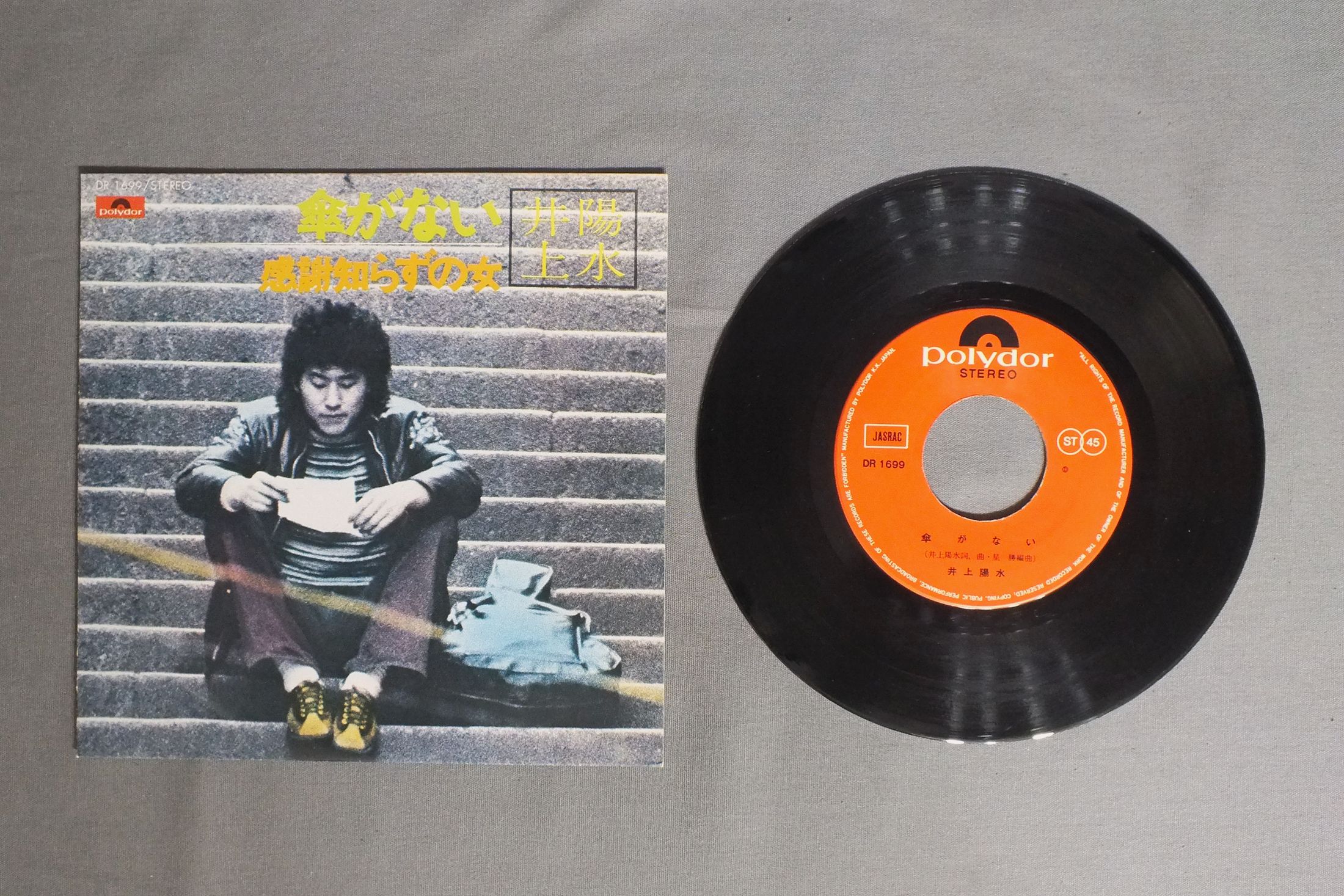 INOUE YOUSUI井上陽水/KASAGA NAI傘がない DR 1699 製造国:日本盤 / Media:7inch外観:EX盤の状態:EX 価格(税込):¥550 送料 7inch:定形外郵便 360円~LP:定形外郵便 660円~送料は、注文の最終画面で確認頂けます。 レコード検索 > J-POP > INOUE YOUSUI/KASAGA NAI 外観 (EX)特記事項:ジャケ表面にシミやよごれ少し有り。リングスレあり。外観EXの共通説明:ダメージが限定的。中古品としては保存状態がよい方。シミ、ヨゴレ、スレ 少し~軽度。 盤の状態 (EX)特記事項:多少薄いスリキズ・スレ軽くある感じ。殆どが軽微なものの様子です。盤EXの共通説明:盤面のスリキズが薄いものが少し~軽度 音に出そうなものは無いように見える(軽微なソフトティック音は除く)。 Tweet それぞれの画像をクリックすると、大きい写真が見られます こちらの商品もお勧めです 990円 CANDIESキャンディーズ / THE BEST