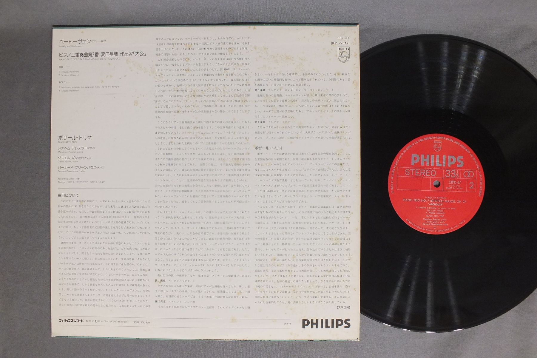 BEAUX ARTS TRIOボザール・トリオ/BEETHOVEN - PIANO TRIO NO.7ベートーヴェン - ピアノ三重奏曲第7番 13PC-47 製造国:日本盤 / Media:LP外観:VG+盤の状態:EX 価格(税込):¥990 送料 7inch:定形外郵便 360円~LP:定形外郵便 660円~送料は、注文の最終画面で確認頂けます。 > > BEAUX ARTS TRIO/BEETHOVEN - PIANO TRIO NO.7 外観 (VG+)特記事項:ジャケ表面にシミやよごれ多少有り。ジャケット表面に薄いリングスレあり。外観VG+の共通説明:ダメージやや有り。シミ、ヨゴレ、スレなど多少~やや多め。 盤の状態 (EX)特記事項:多少薄いスリキズ・スレ軽くある感じ。殆どが軽微なものの様子です。盤EXの共通説明:盤面のスリキズが薄いものが少し~軽度 音に出そうなものは無いように見える(軽微なソフトティック音は除く)。 Tweet それぞれの画像をクリックすると、大きい写真が見られます こちらの商品もお勧めです 1,320円 ACHENBACH - DAS HEIDELBERGER KAMMERORCHESTERアッヘンバッハ - ハイデルベルグ室内管弦楽団 / BACH - MESSE IN H-MOLLバッハ - ロ短調ミサ曲
