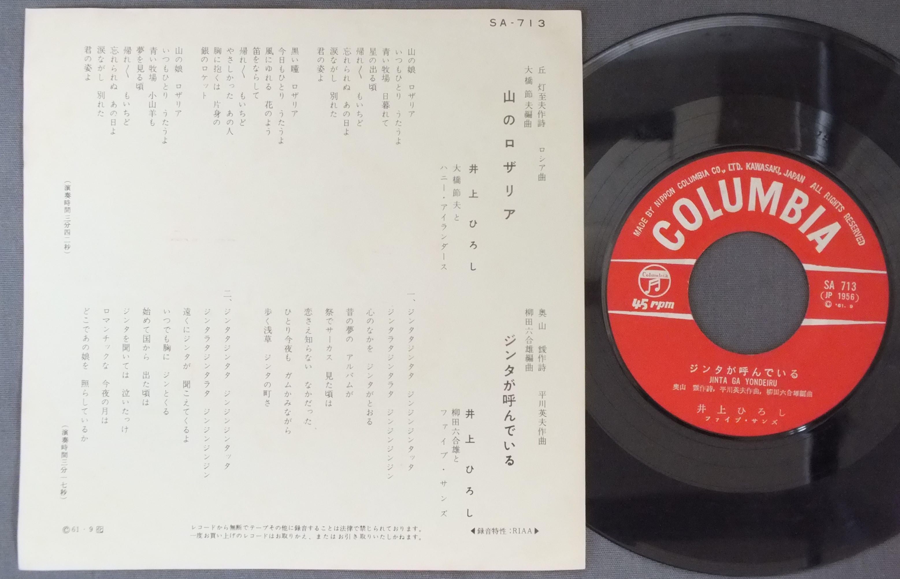 井上ひろし井上ひろし/山のロザリア山のロザリア SA713 製造国:日本盤 / Media:7inch外観:EX-盤の状態:VG+ 価格(税込):¥880 送料 7inch:定形外郵便 360円~LP:定形外郵便 660円~送料は、注文の最終画面で確認頂けます。 > > 井上ひろし/山のロザリア 外観 (EX-)特記事項:多少ヨレやよごれ、褪色有り。左上隅に小さく書き込み。外観EX-の共通説明:ダメージ軽度~多少。 中古品としては普通の状態。シミ、ヨゴレ、スレなど軽く~多少。 盤の状態 (VG+)特記事項:薄いスレやスリキズ有りますが軽微なものが中心です。盤VG+の共通説明:盤面にスリキズが多少~やや有り、音に出そうなものも多少ある。 Tweet それぞれの画像をクリックすると、大きい写真が見られます こちらの商品もお勧めです